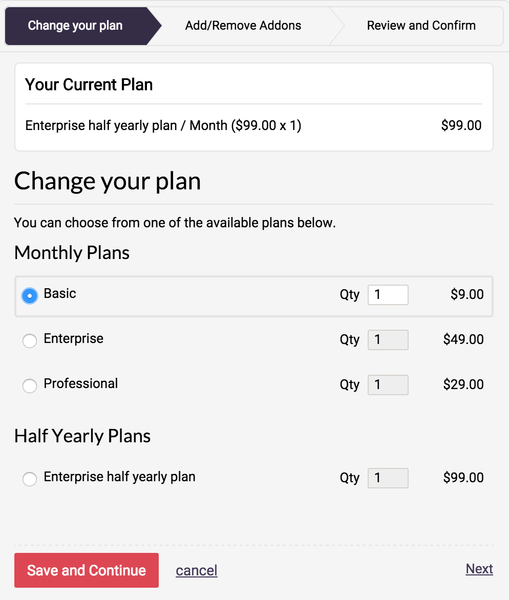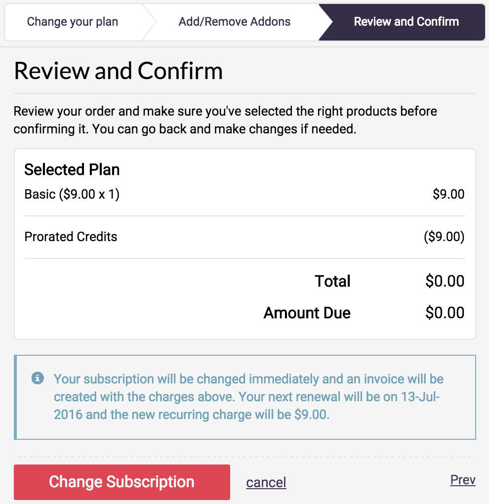 This allows users to change their subscription plan and addons (if any). When changing the subscription, you can allow users to either allow the change to happen immediately (with/without proration) or at the next renewal. You can also limit the subscription change to just plans or addons.