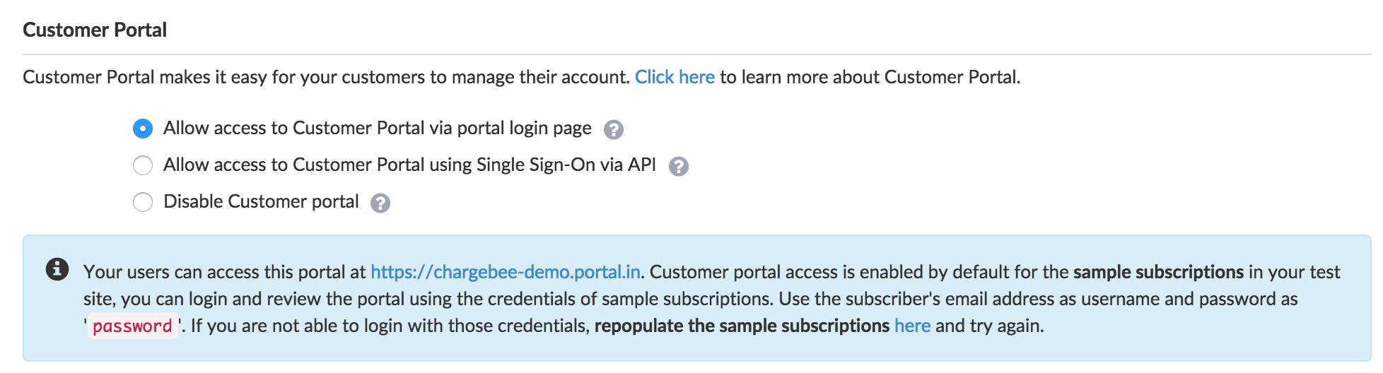 This will only be shown if the customer portal is enabled for your Chargebee site.