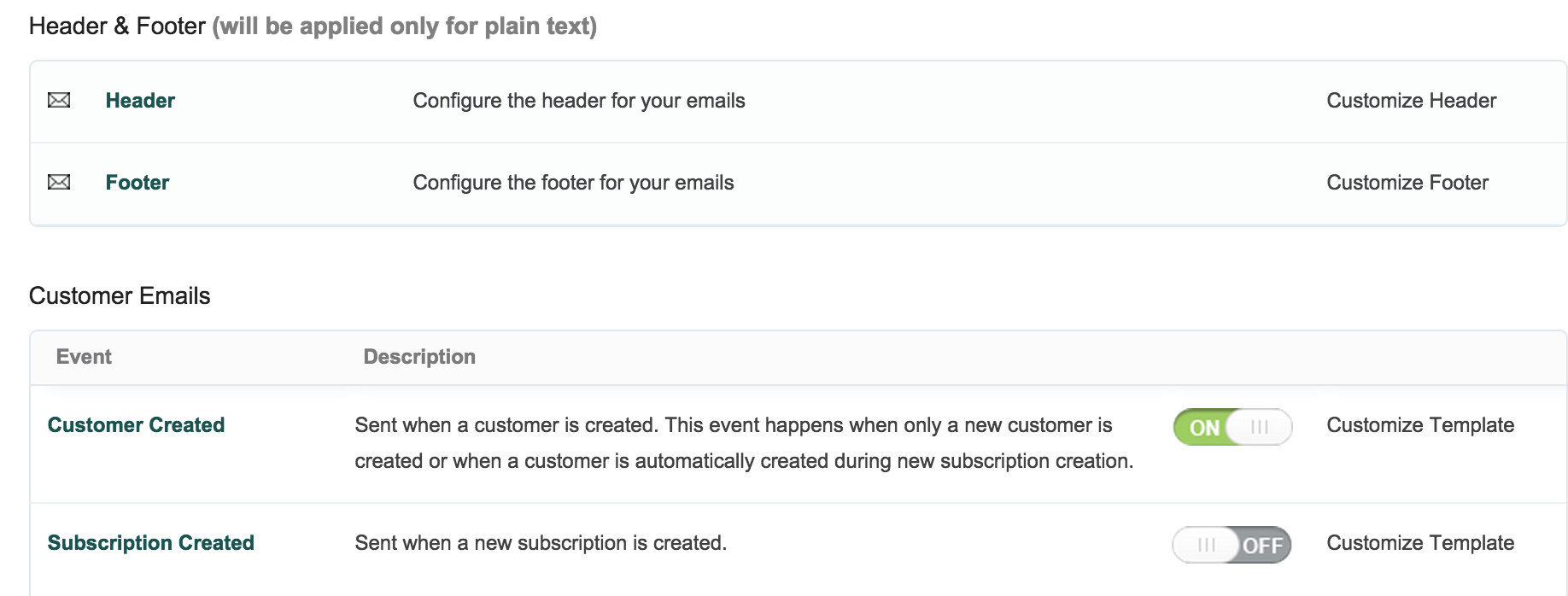 Configure the header and footer, and enable the events that should automatically notify your customers.