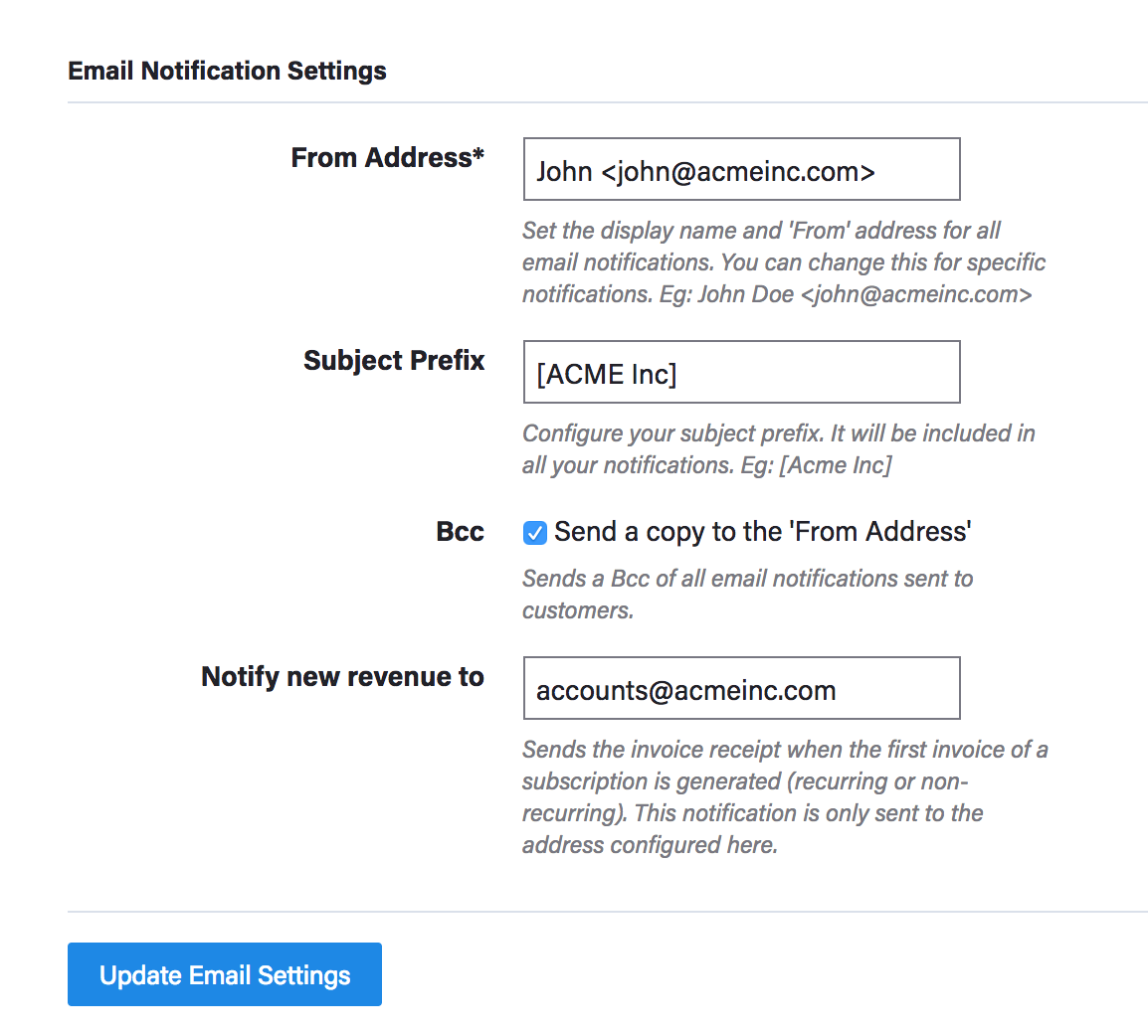 Notify new revenue to – Configuring an email address here will send the recipient the first invoice generated for each subscription. The subject line of this email will have the prefix "[First Invoice]." This receipt will be sent even if the Invoice Receipt email notification is turned off.