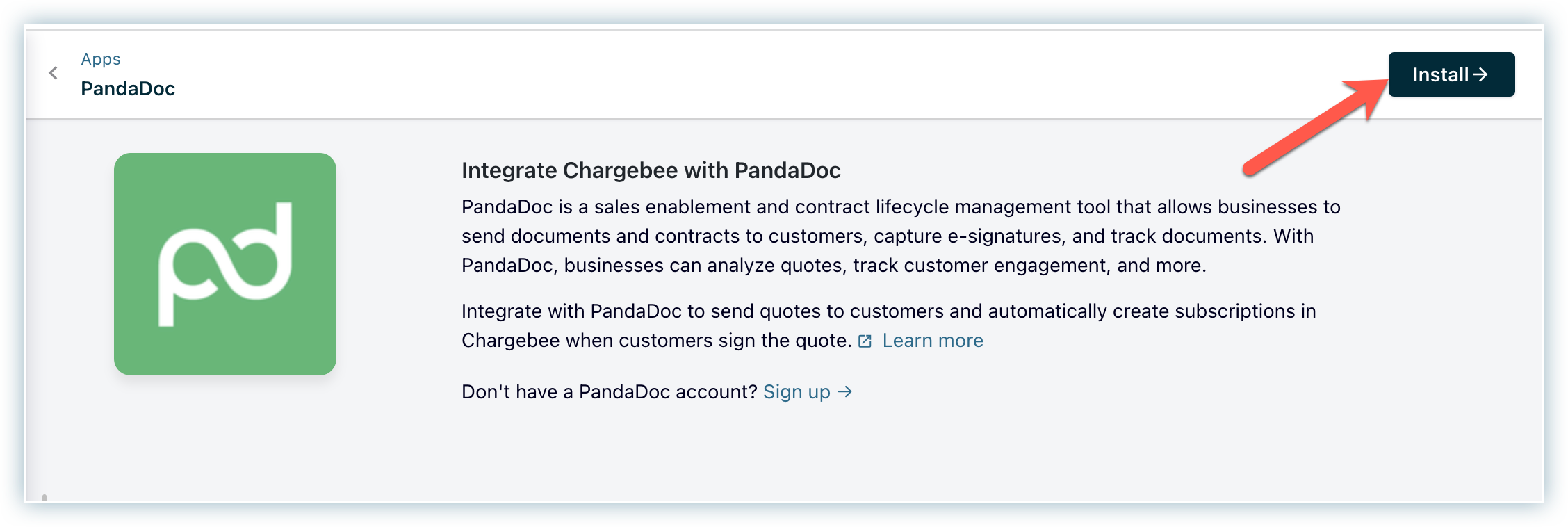 To integrate PandaDoc with Chargebee, install the PandaDoc app from Chargebee's App Marketplace. You can connect an existing PandaDoc account or sign up for a new account to complete the integration.