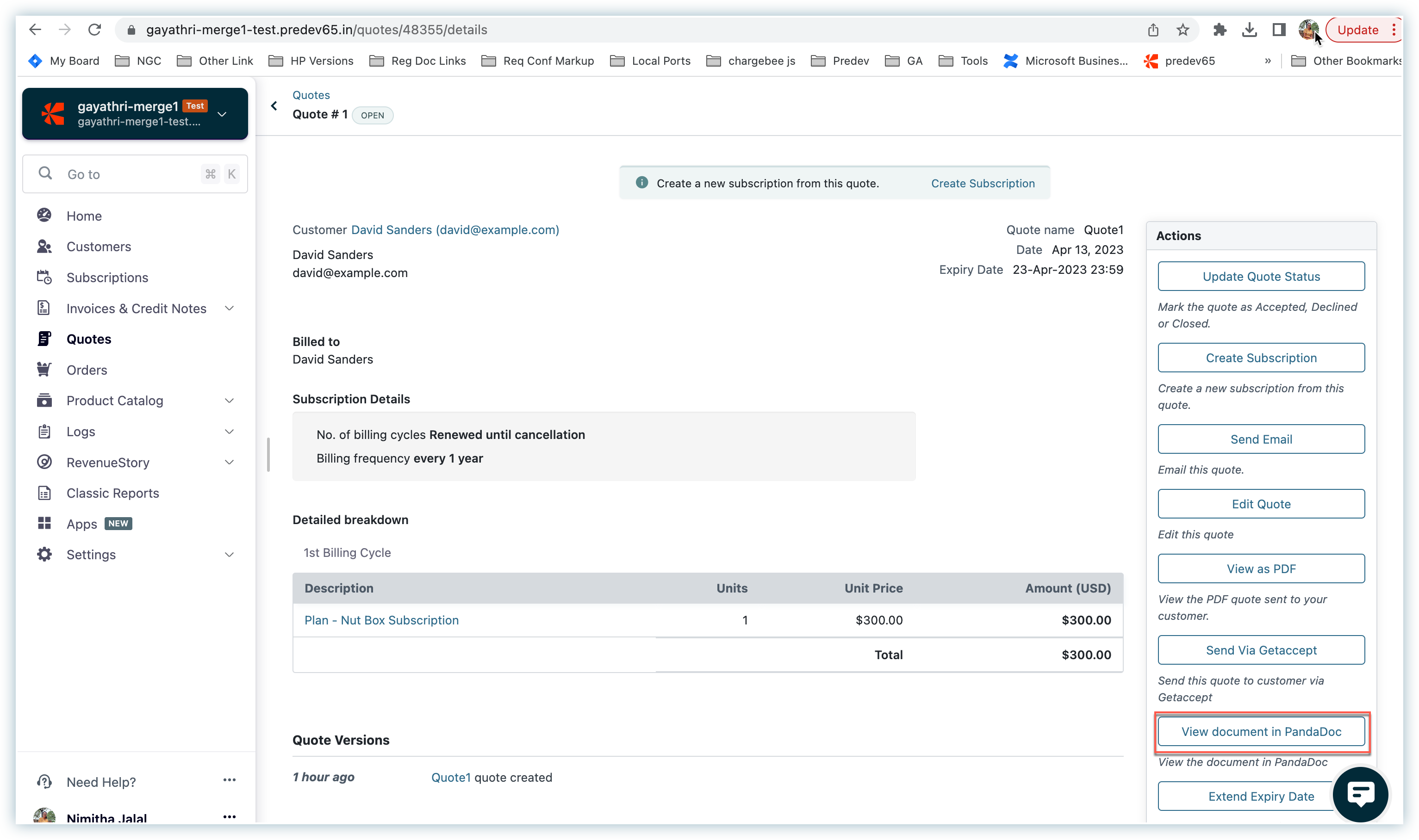 After sending the quote via PandaDoc, the quotes page in Chargebee displays the following details: