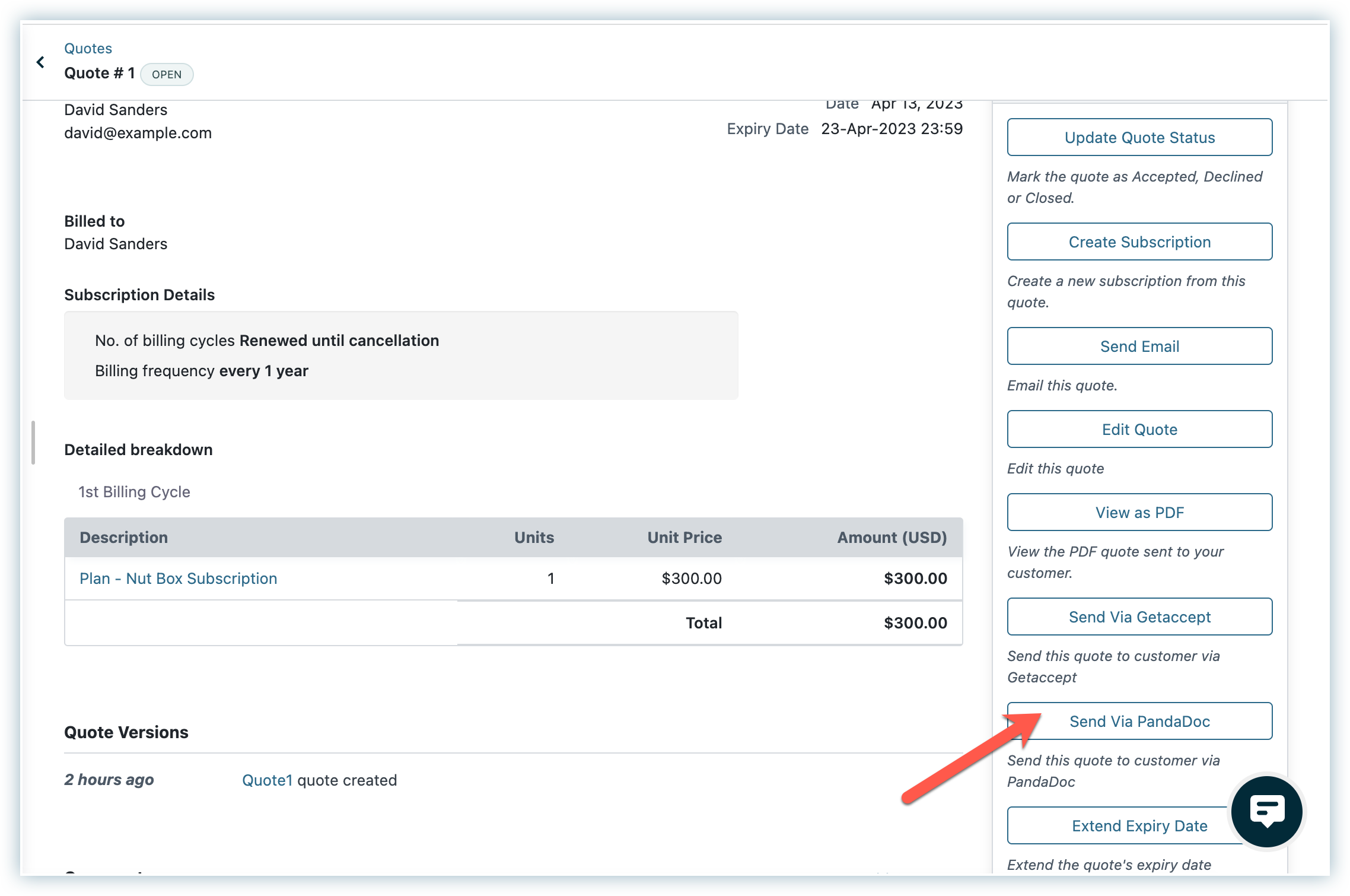 Click Send via PandaDoc to send the quote for e-signature. The quote details will be pre-filled with the configurations set earlier.