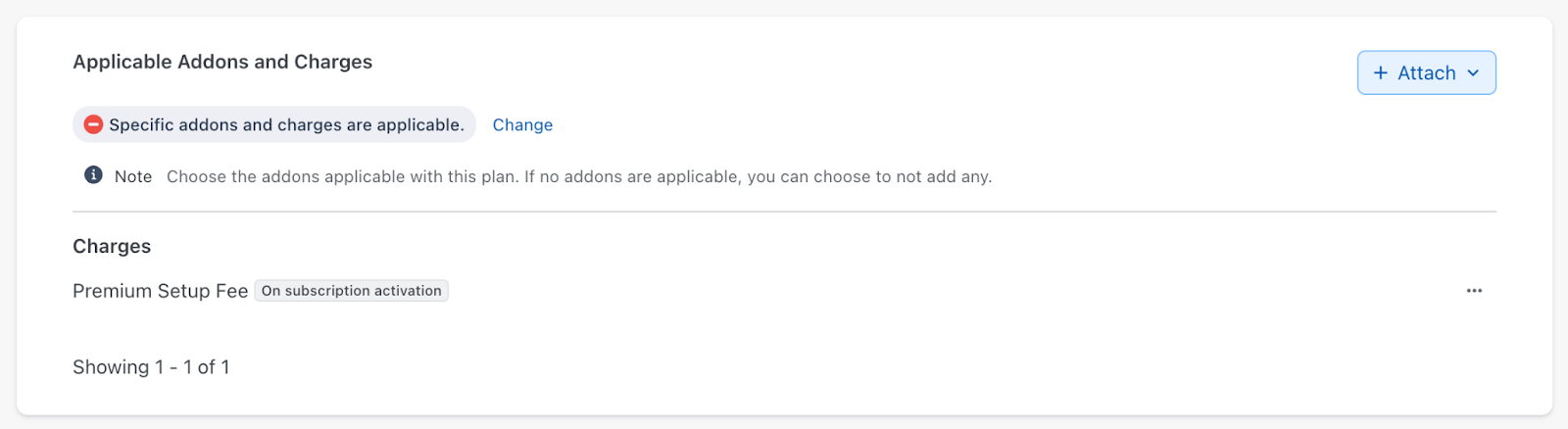 For all Legacy Product Catalog plans containing setup fees, a non-recurring charge is auto-created in Latest Product Catalog under Product Catalog > Charges with the naming convention 'Setup Fee'. This charge is attached to the relevant plan when the subscription is activated, as shown below. Note: Latest Product Catalog does not support adding setup fees during plan creation.