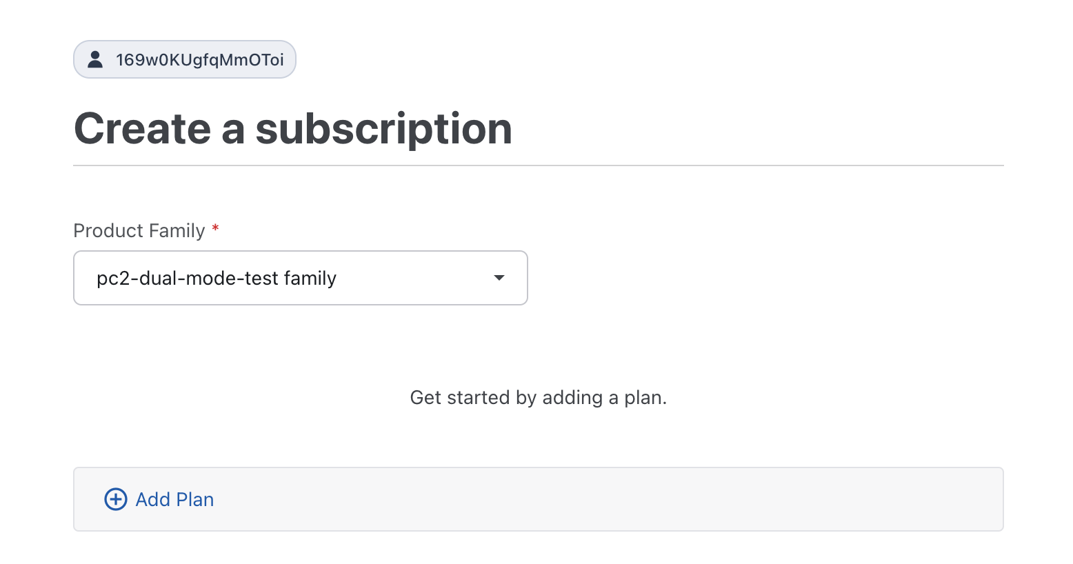 The default product family is auto-created and pre-selected. To create a new subscription, click the Product Family drop-down and select the product family of the plan for which you are creating the subscription.