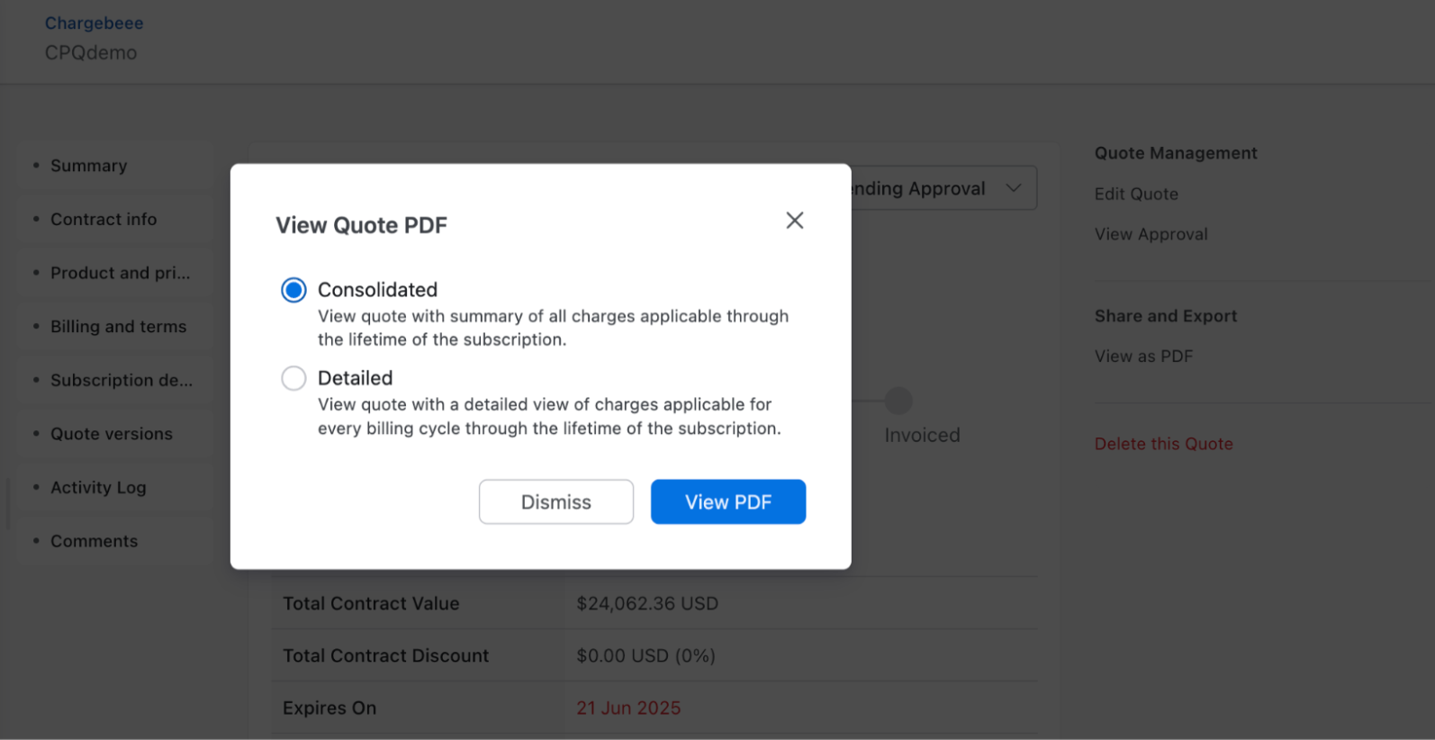 Navigate to the Quote > Quote Index Page. Select a quote to display Quote Details Page, click View as PDF to download the quote.
