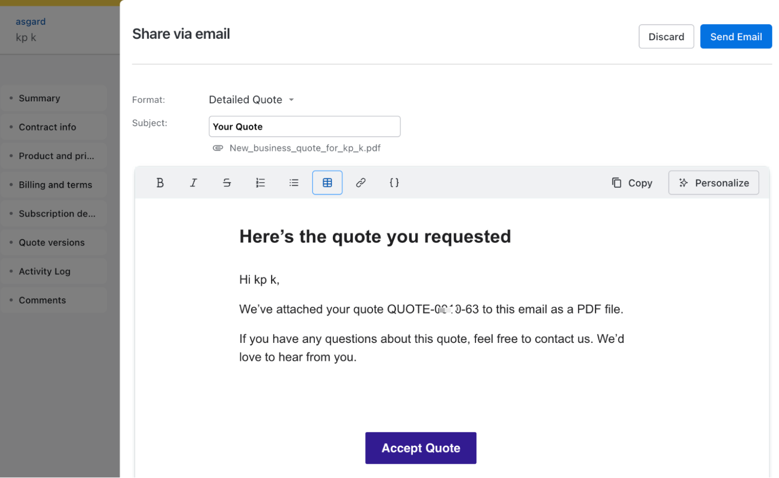 Navigate to the Quote > Quote Index Page. Select a quote to open the Quote Details Page, click Send via PandaDoc to send the quote using PandaDoc e-signature to collect the customer's acceptance electronically.