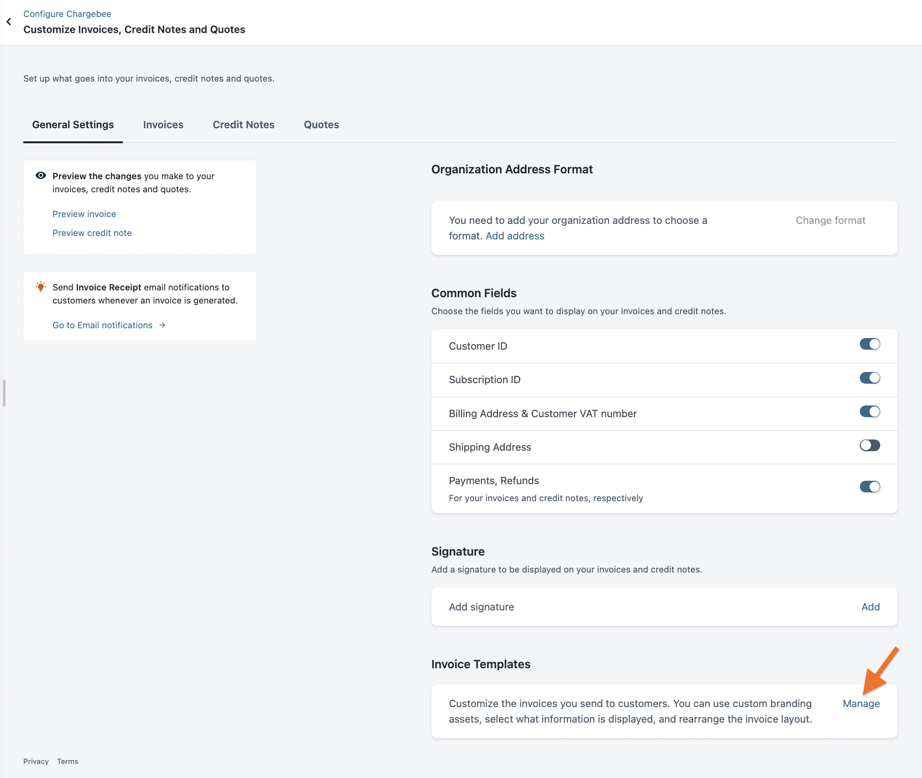 Navigate to Settings > Configure Chargebee > Invoices, Credit Notes and Quotes > General Settings > Invoice Templates. Click Manage.