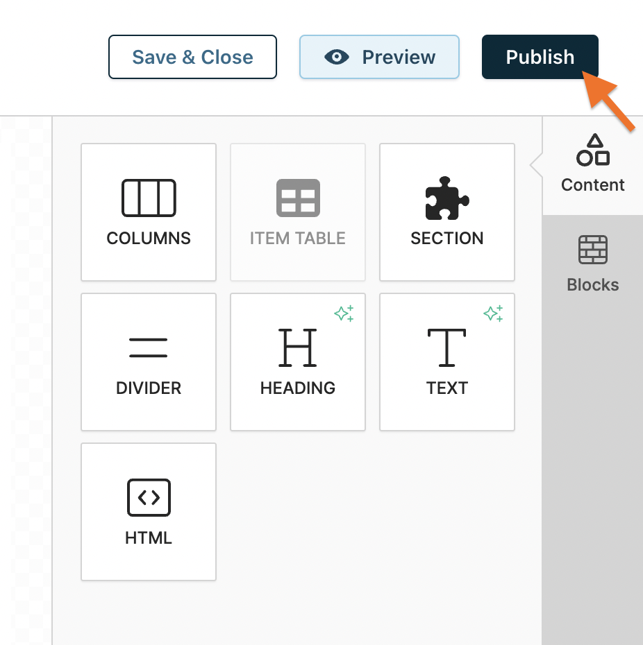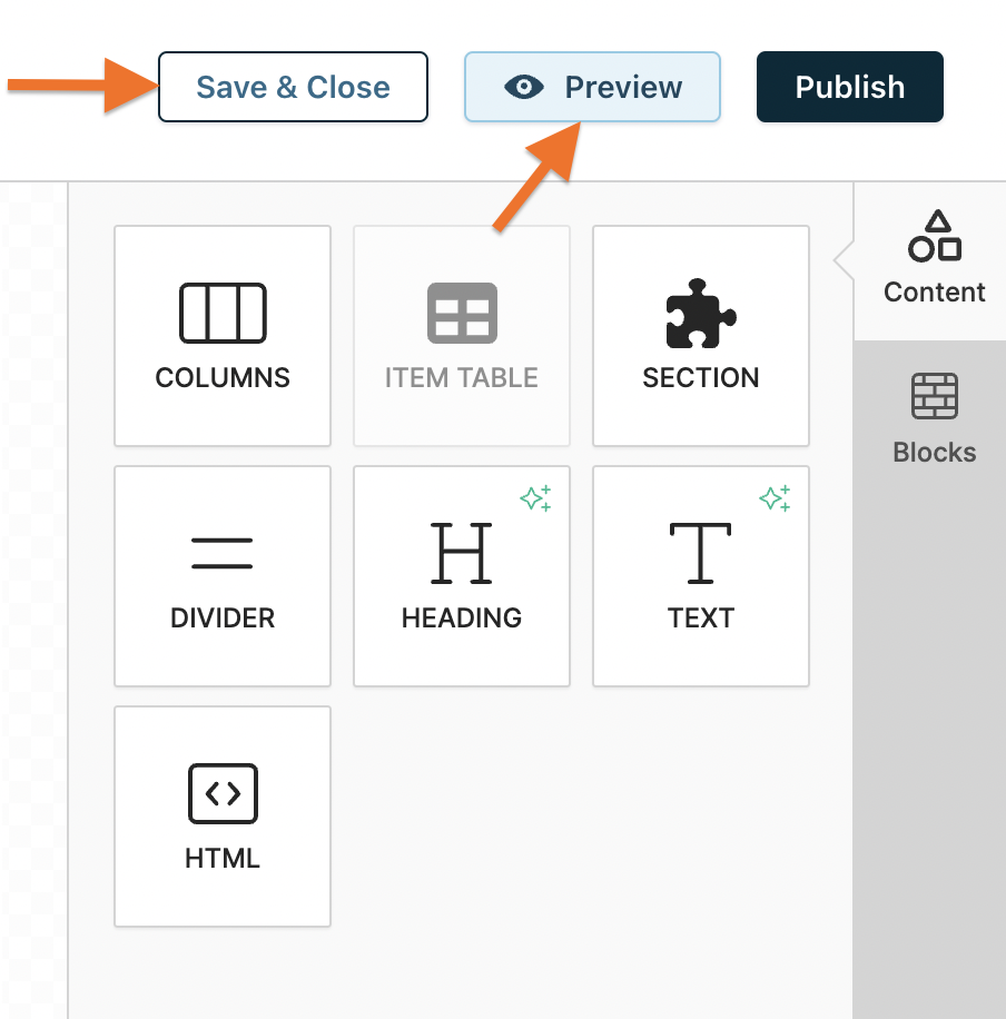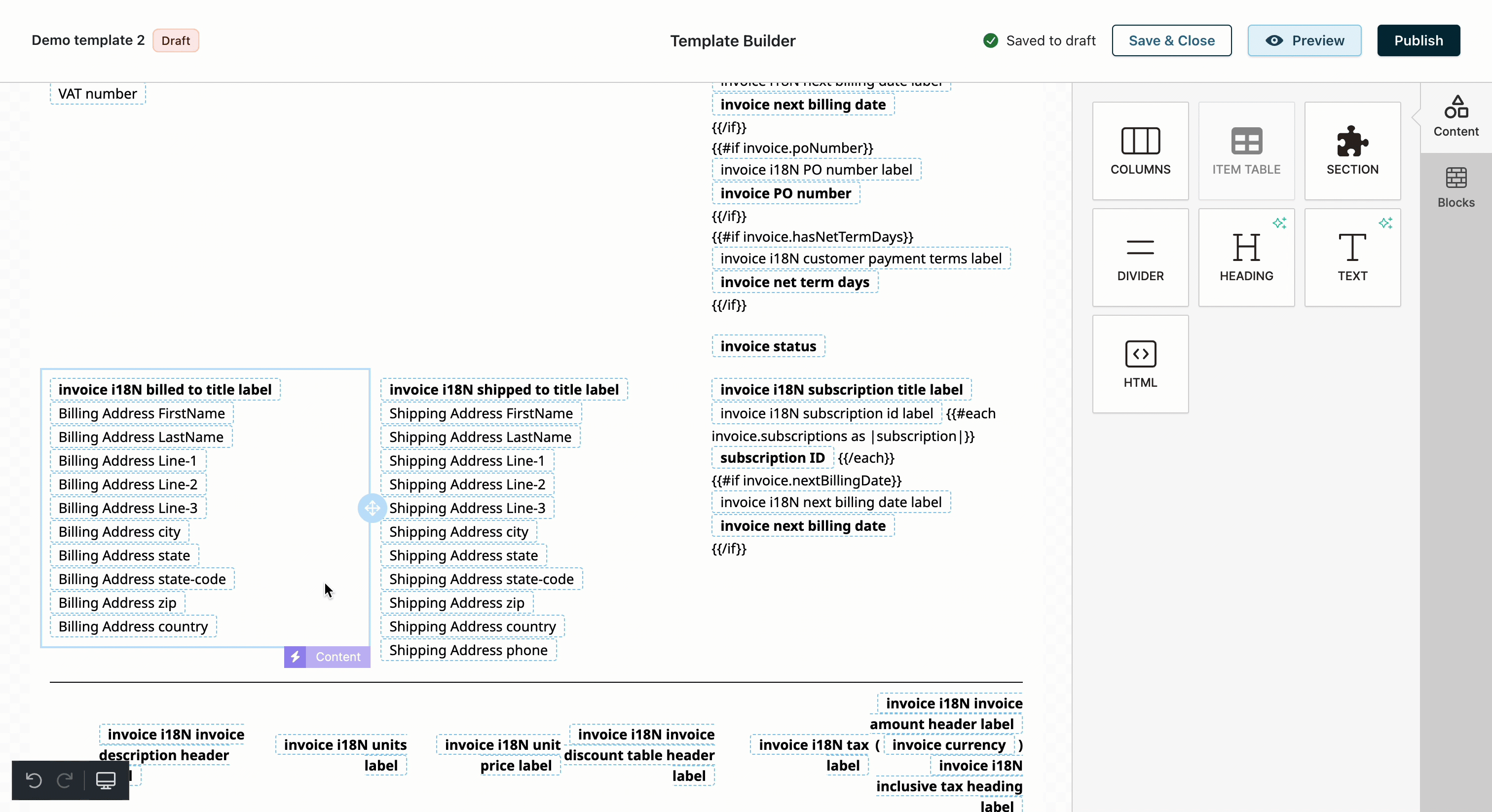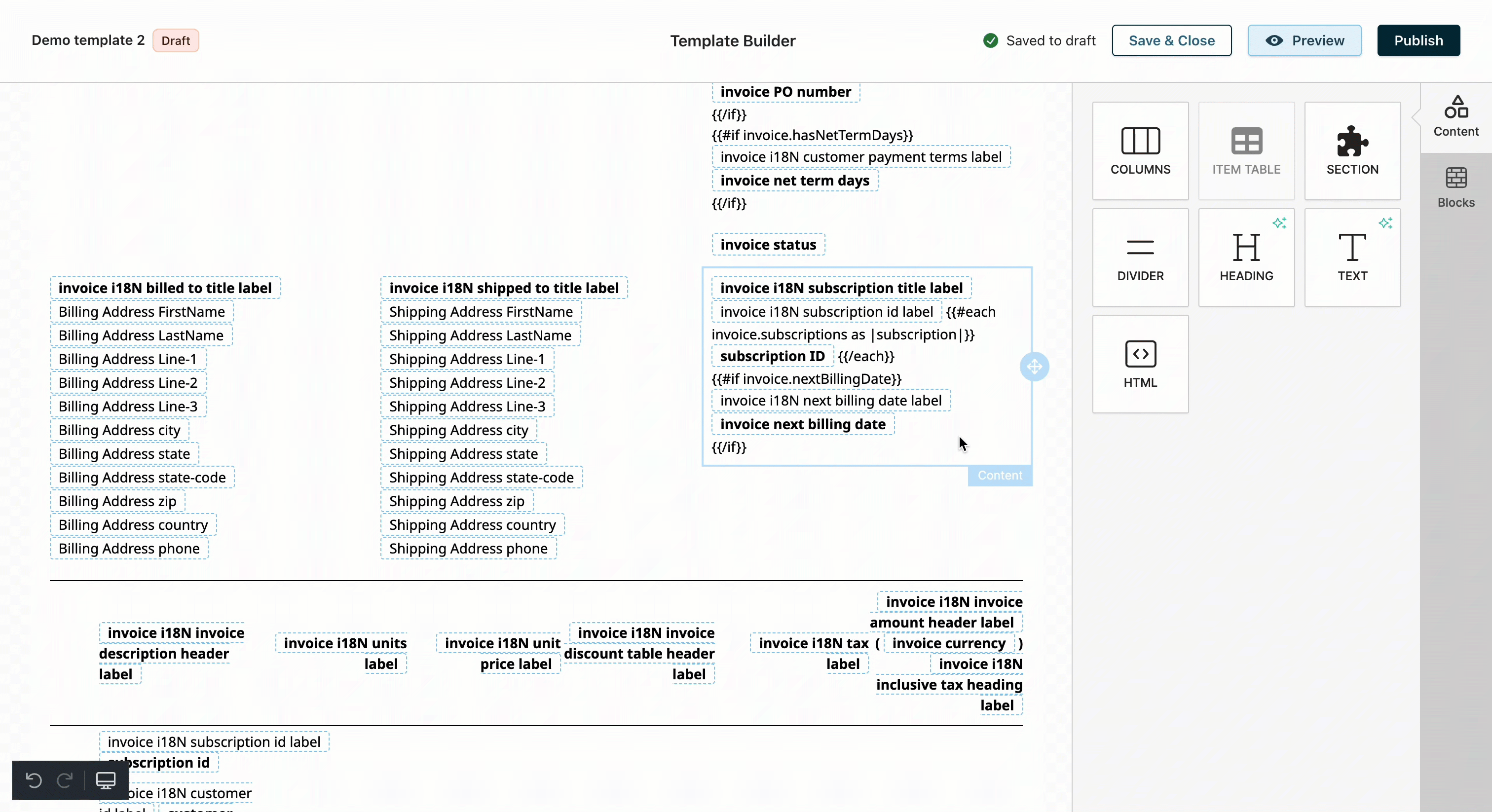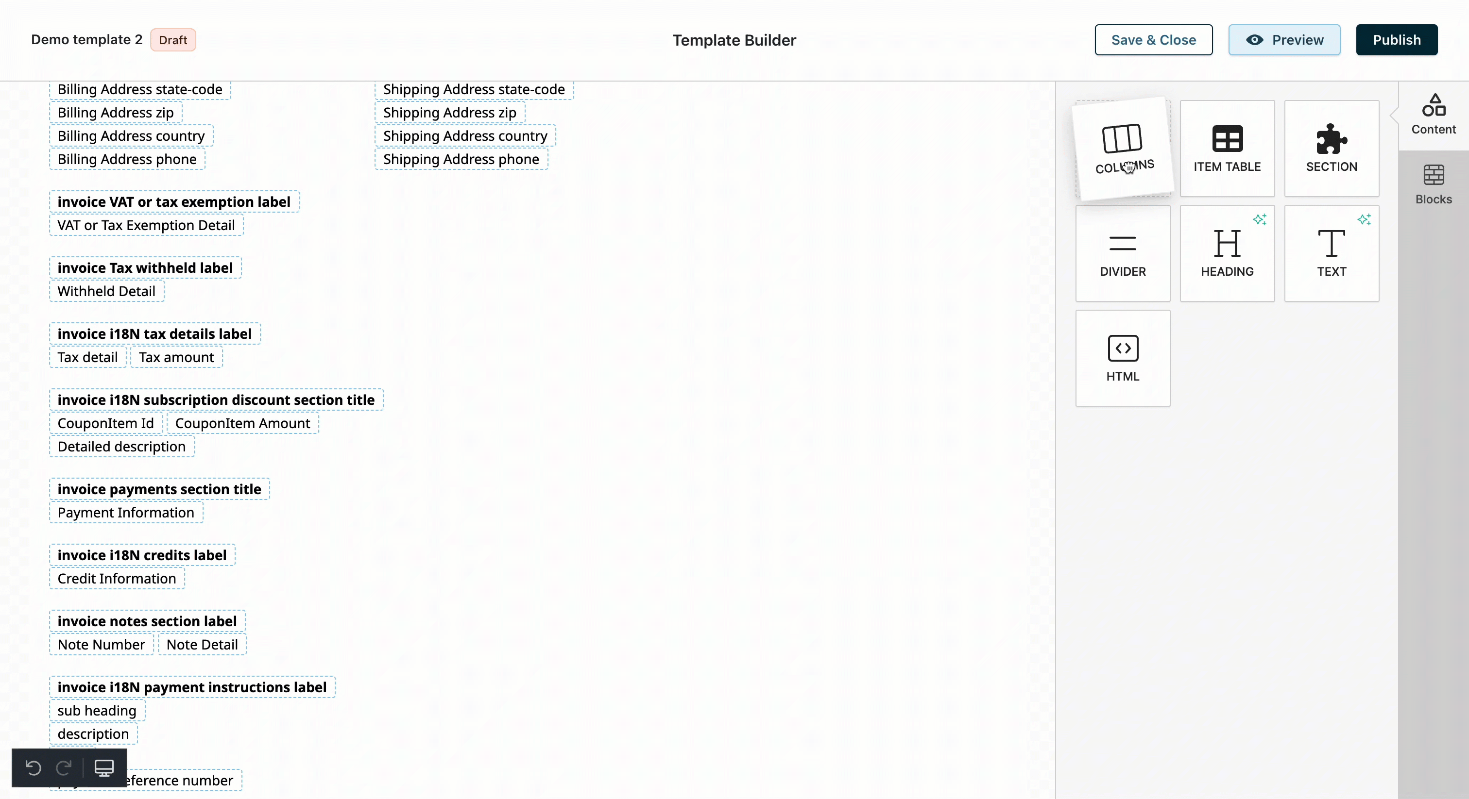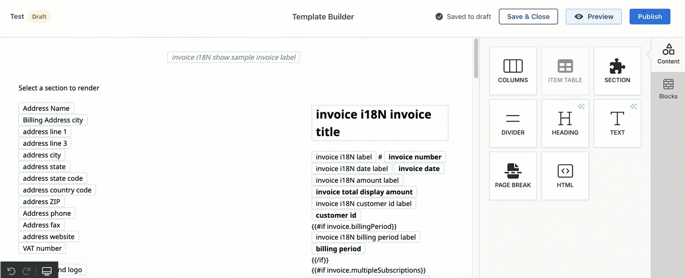 Add Sections Include various invoice components such as the Invoice block, Subscription block, Payments & Credits block, and more, in a visually intuitive manner for you to construct an invoice from scratch.