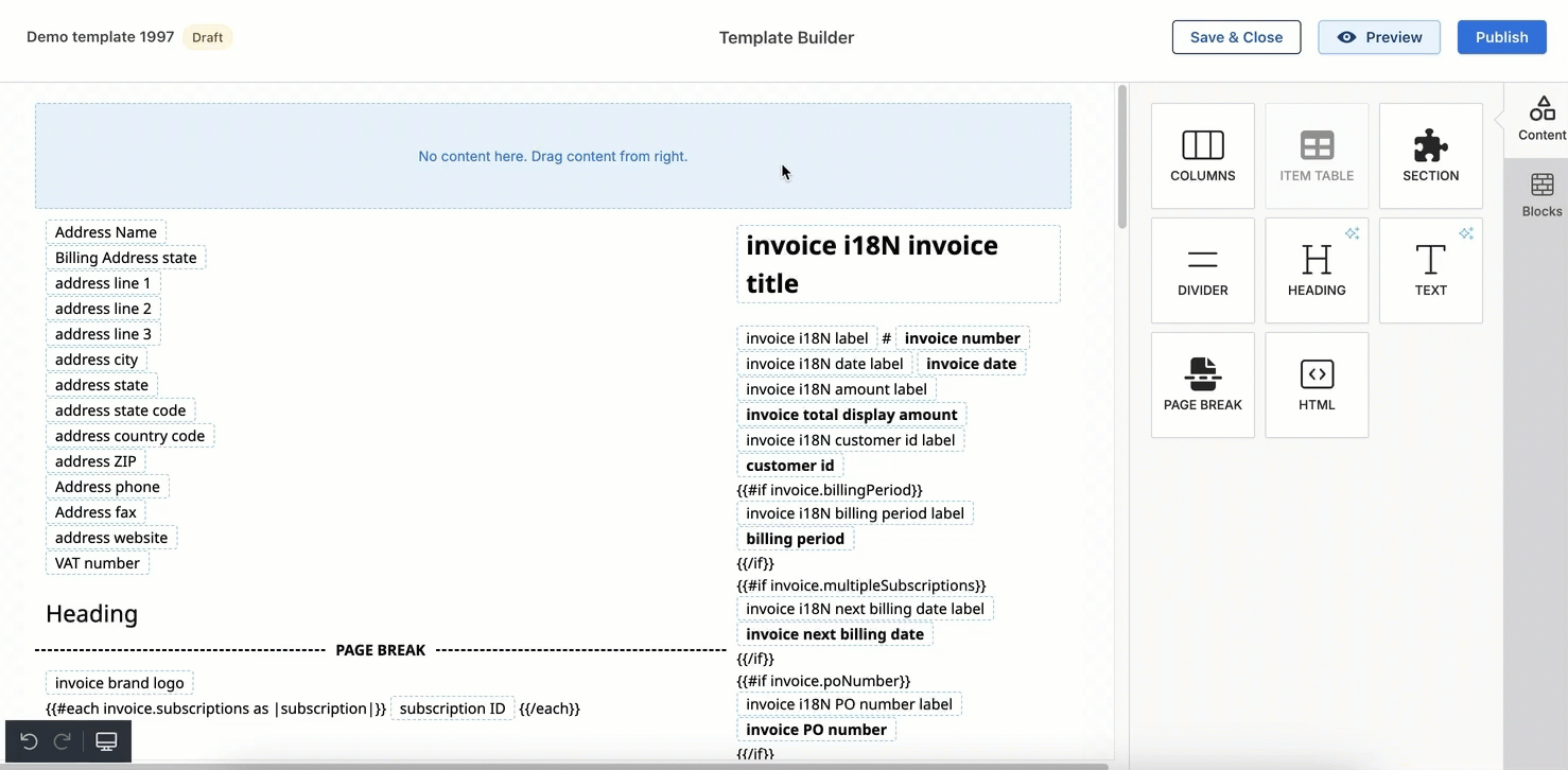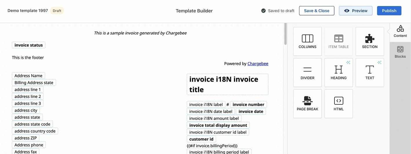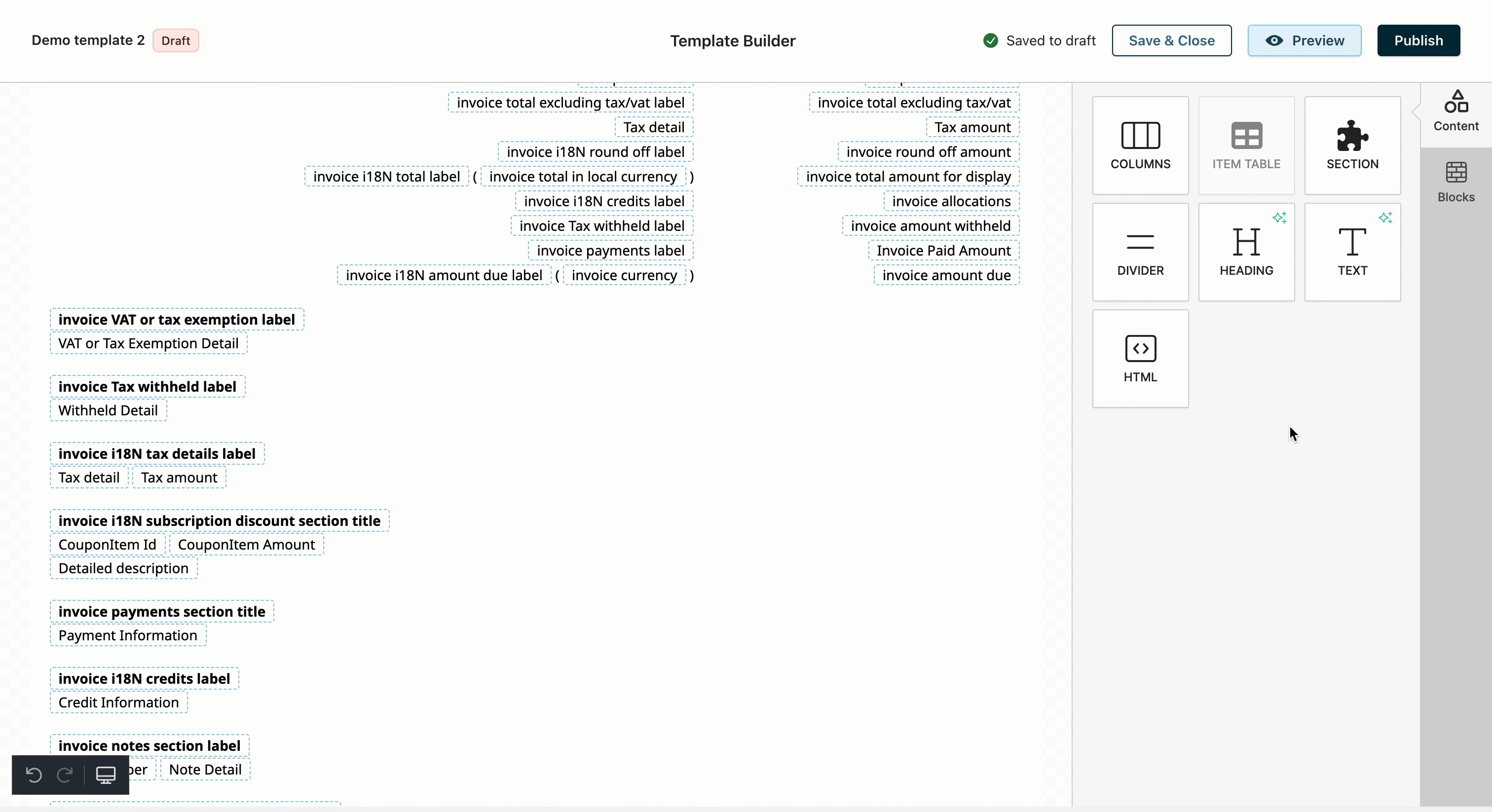 This feature provides a powerful yet intuitive platform for creating customized invoice templates. It supports drag-and-drop functionality for easy design, including essential elements like text, images, custom HTML blocks, merge variables, and more. This allows for the creation of detailed and branded invoices, ensuring templates meet unique business requirements efficiently.