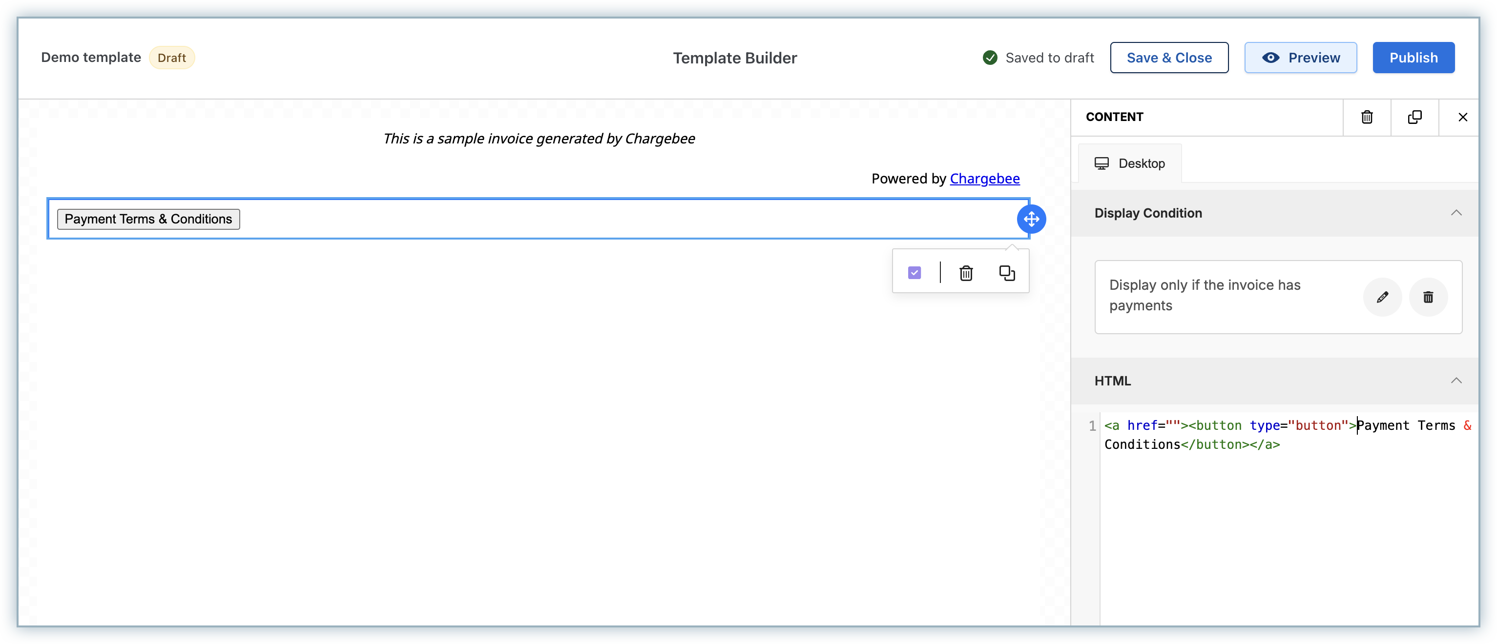 Add Display Condition Include the display condition for the content appearance on your invoice. You can add one display condition at a time.