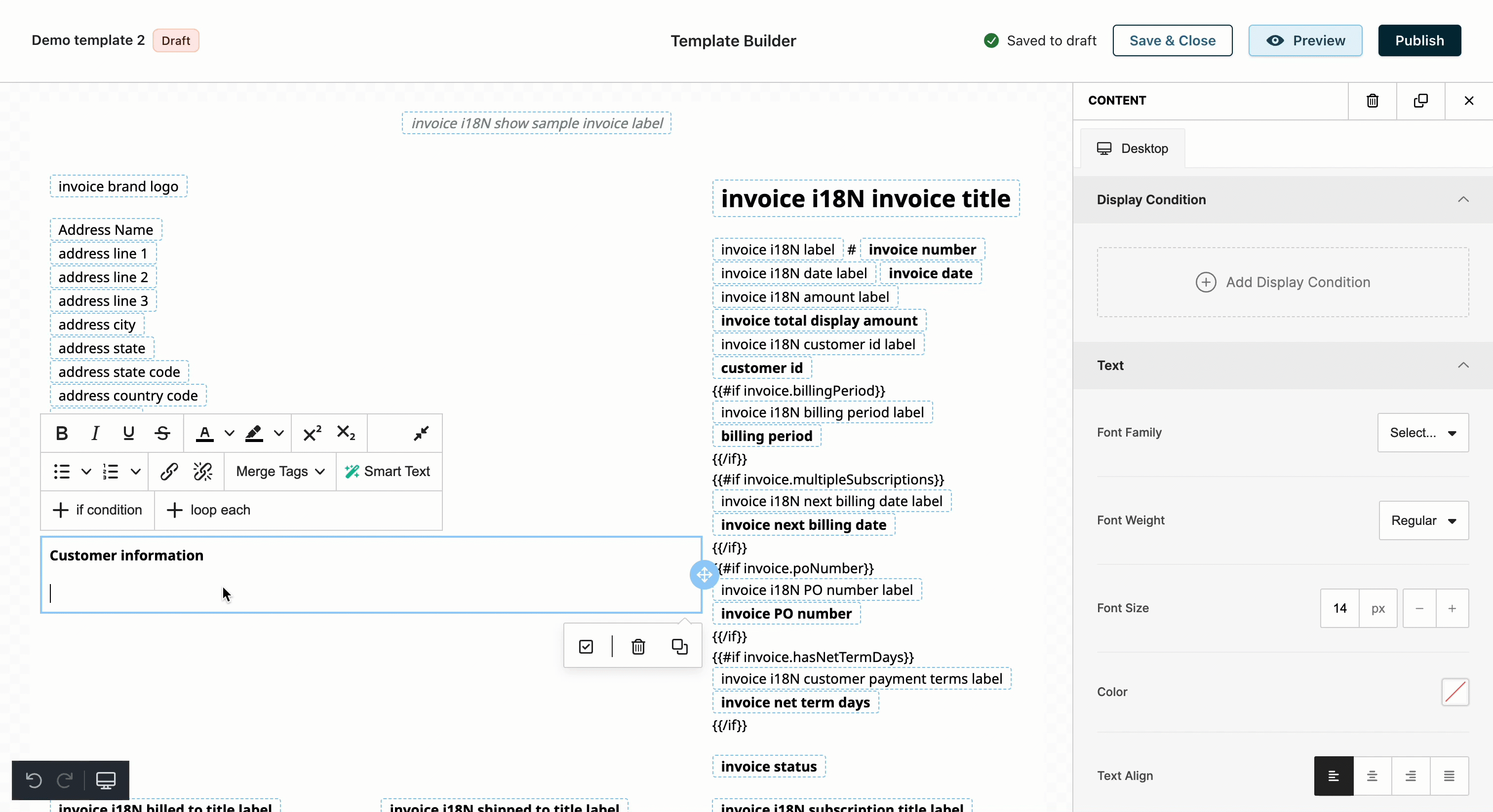 This section will talk about template customization through various editors, conditions, and more. You can use multiple content formatting options to customize your content like bold, italics, ordered list, unordered list, hyperlink, merge tags, smart text, and more.