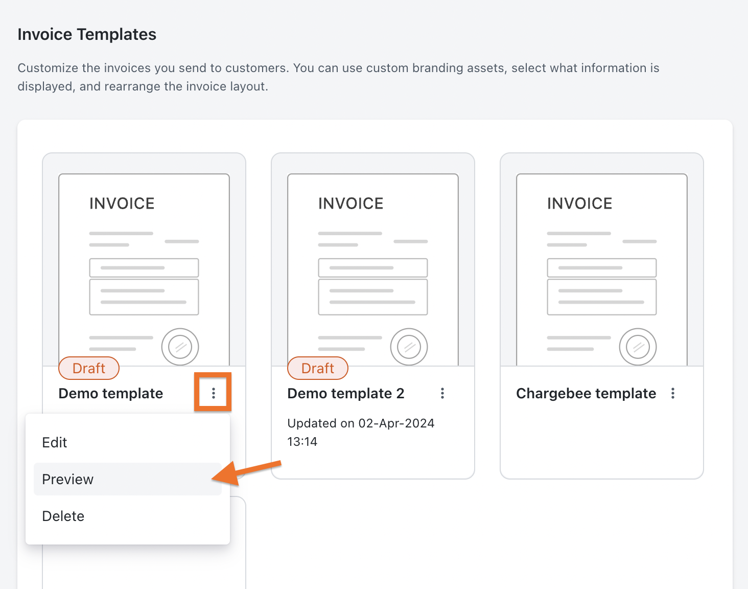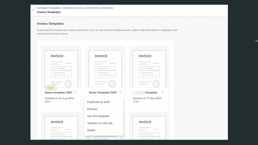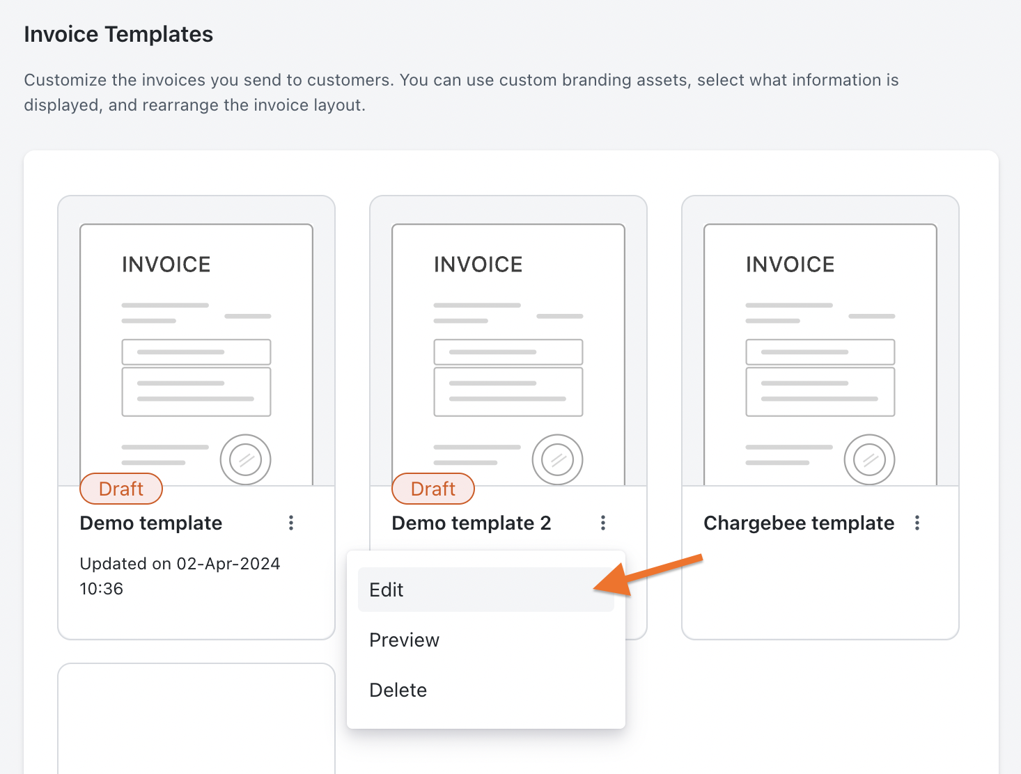 Click Delete to remove a drafted or published template. You cannot delete a Default template. Note: You cannot delete the IN USE template and Chargebee template.