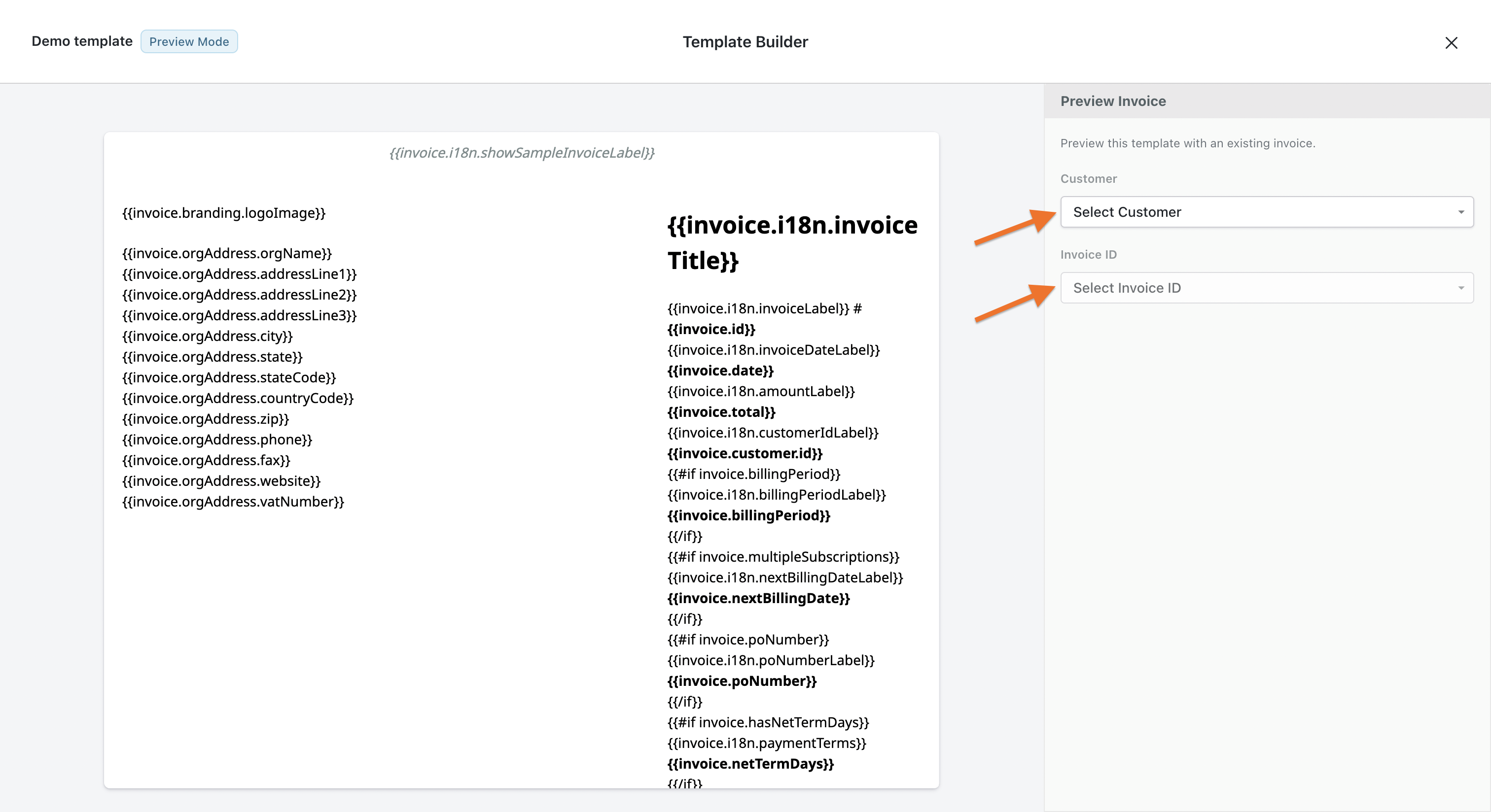 In the Preview screen, select the Customer from the drop-down and select the Invoice ID that is associated with the customer. This feature will help you to preview your template for a specific invoice of a customer.