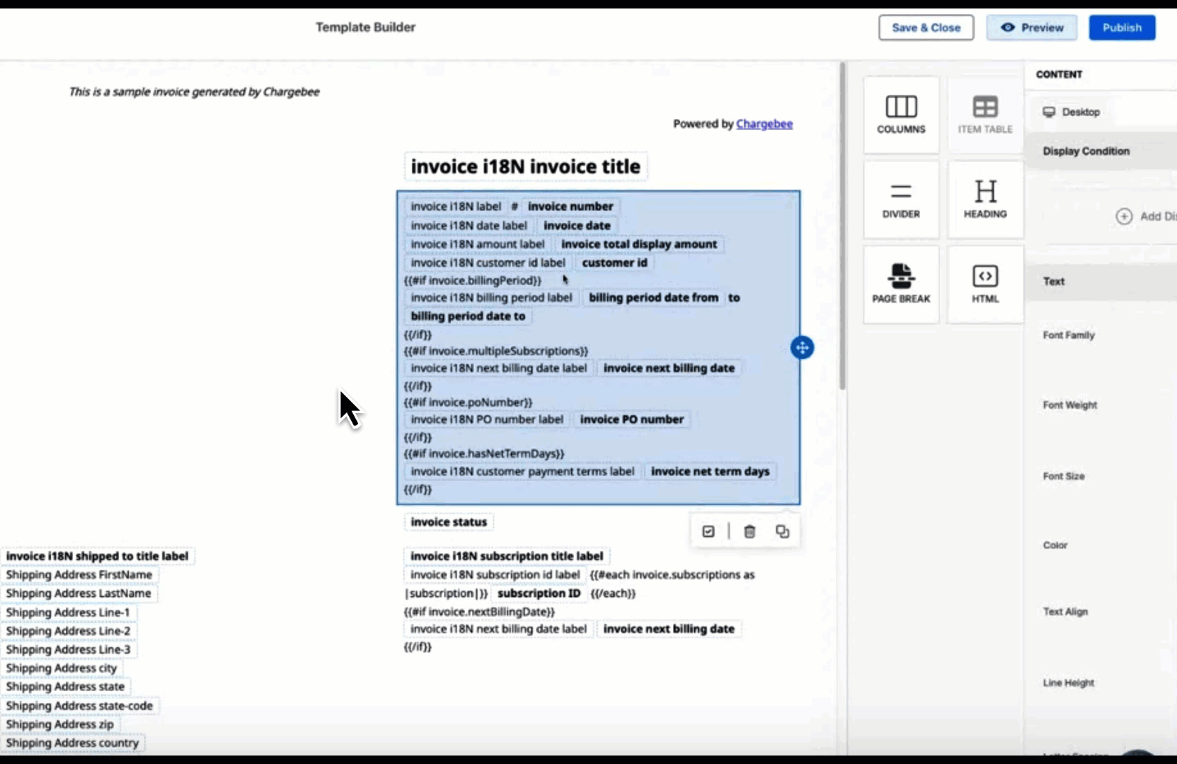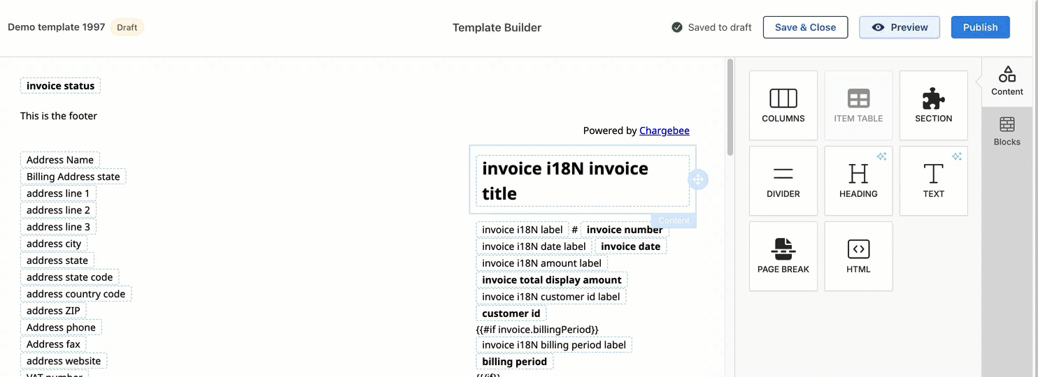 Add Merge Variables Include fields that already exist within the Chargebee like billing address, shipping address, subscription ID, Invoice status, and more using the Merge Tags option in the content format panel.