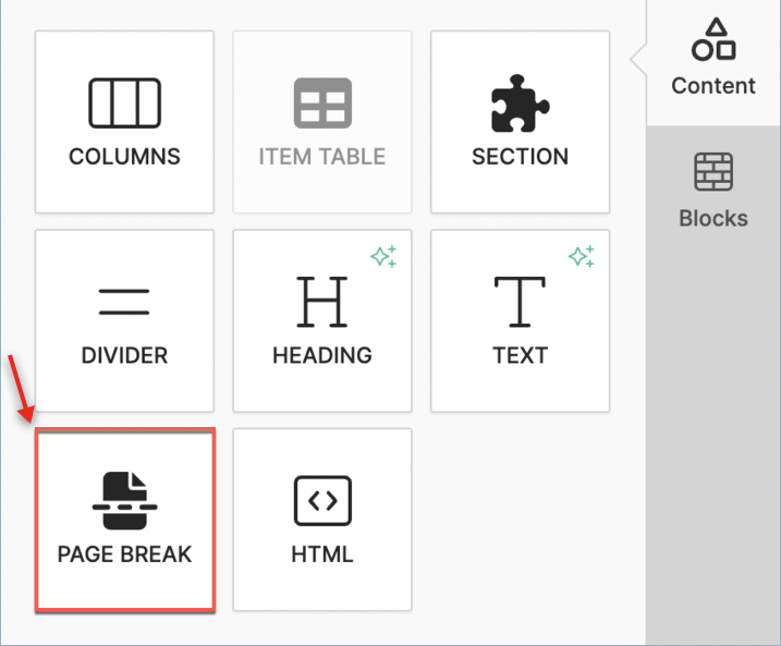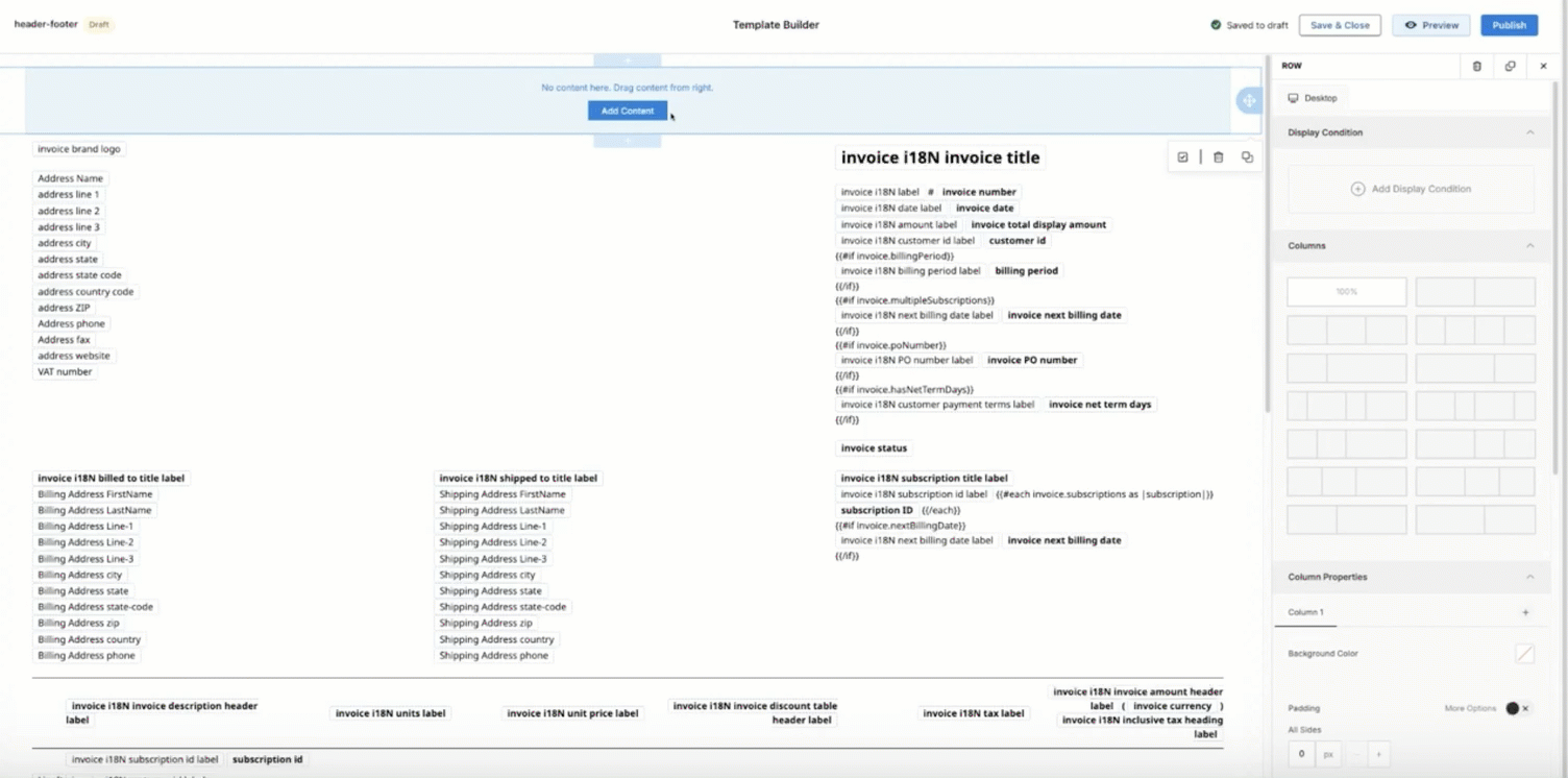 Add Header Add a header to your invoice by dragging the SECTION from the Content block and selecting Header from the dropdown. The header will be displayed at the top of every page, and you can drag and drop the header section to the top of your invoice.