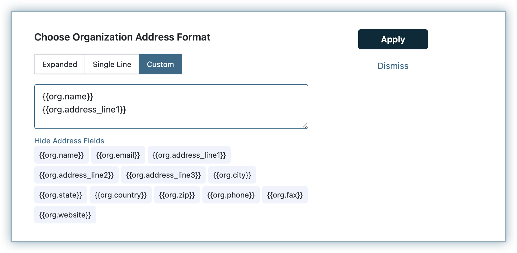 If the address of your organization has been added to your profile, this section gives you a way to choose how it appears on the PDFs.