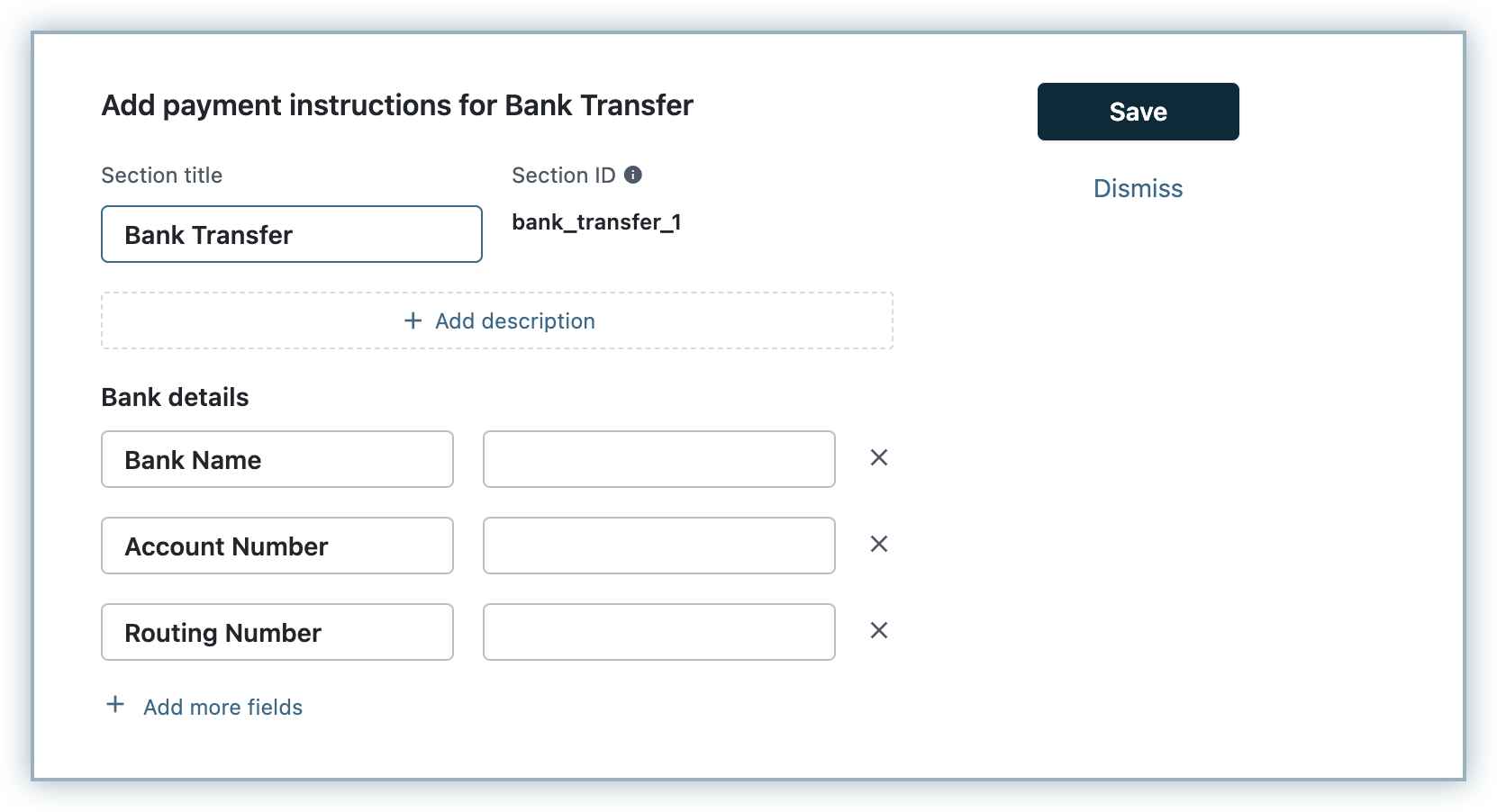 Since you may have different bank transfer particulars for different regions, any number of Bank Transfer type payment instructions can be added to the PDF invoice. For each such instruction, up to 9 fields can be added.