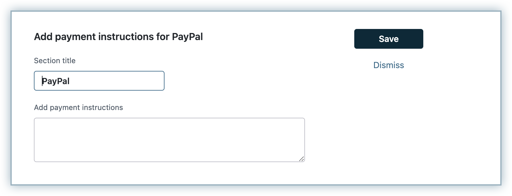 For PayPal instructions, a section title and description can be specified. Only one PayPal payment instruction may be configured for your site.