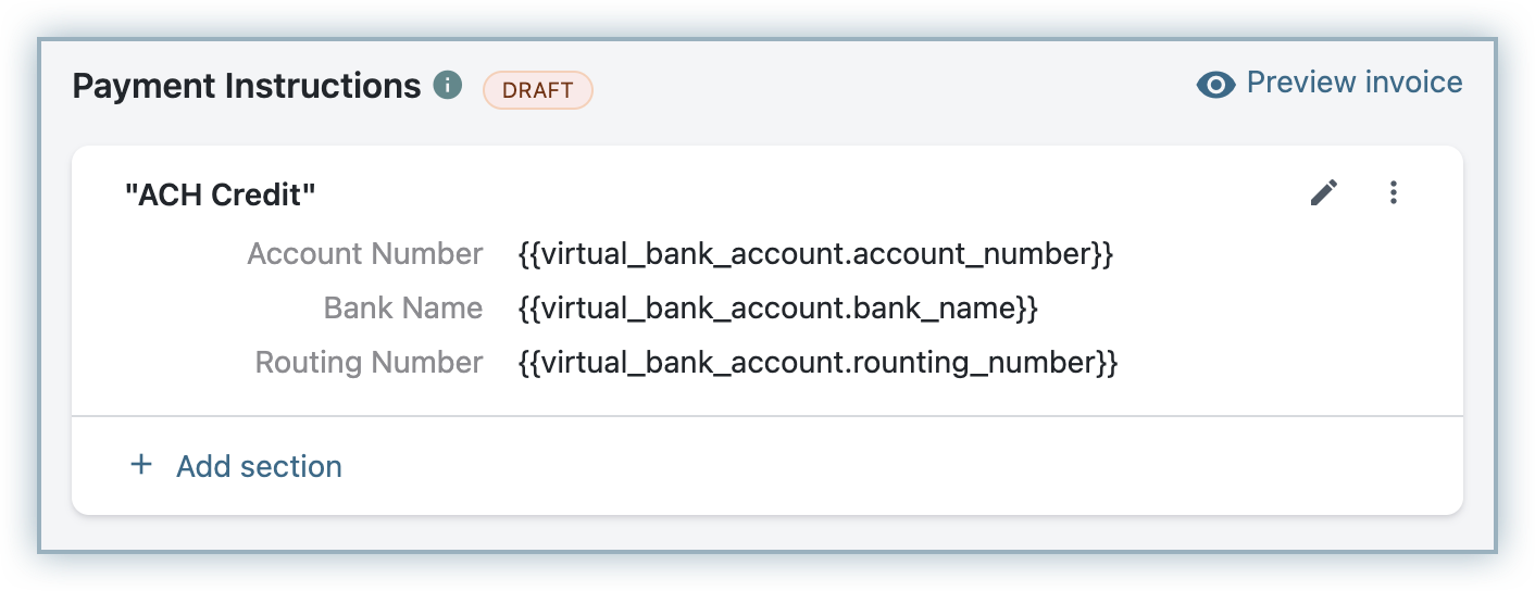 When a customer has a Stripe virtual bank account, ACH credit transfer instruction (if enabled) is included in their PDF invoices. Whenever ACH credit transfer instruction is present, bank transfer instructions (if any) are not included in the PDF.