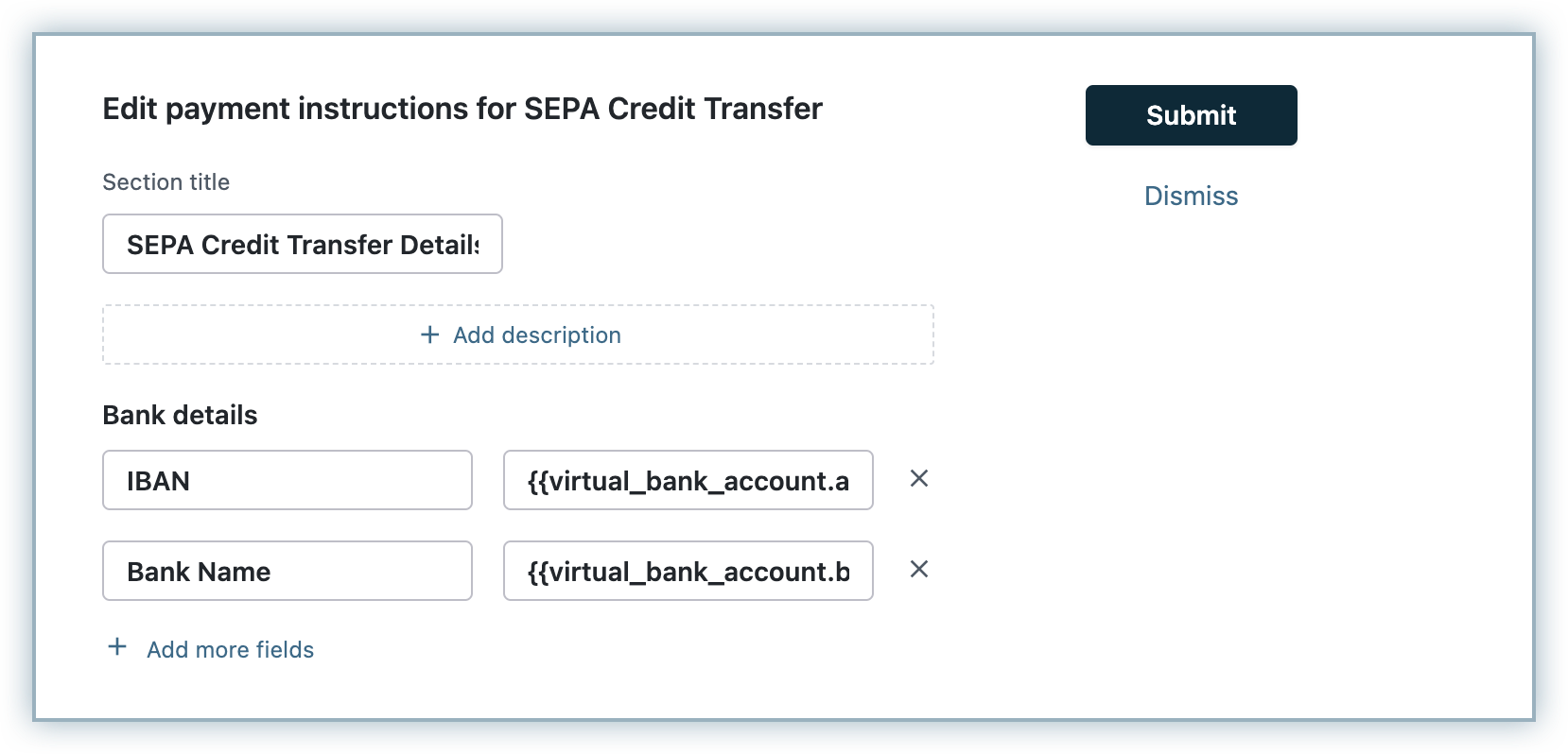 When a customer has a Stripe virtual bank account, SEPA credit transfer instruction (if enabled) is included in their PDF invoices. Whenever SEPA credit transfer instruction is present, bank transfer instructions (if any) are not included in the PDF.