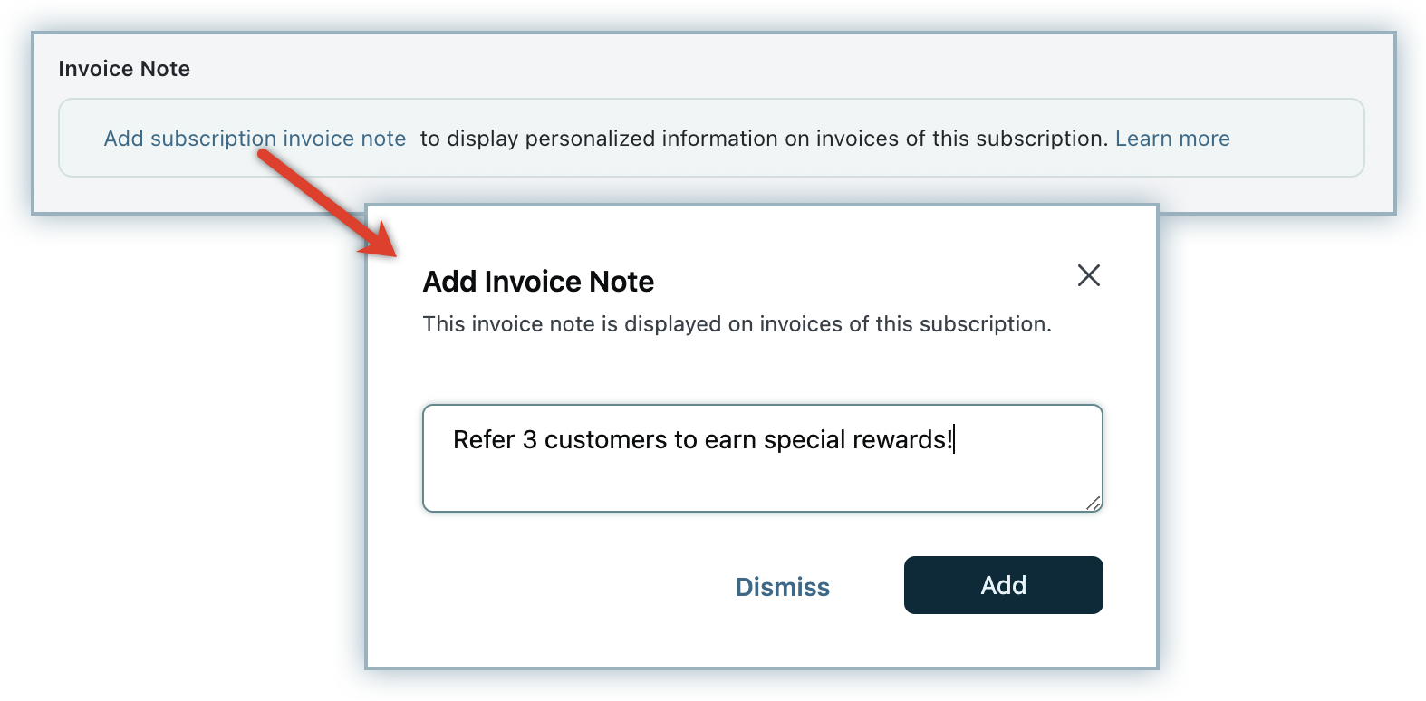 Invoice Notes specific to each customer or subscription can be provided. You can also set them up at the Plan, Addon, or Coupon level to ensure they are included only when that specific item is part of the invoice.