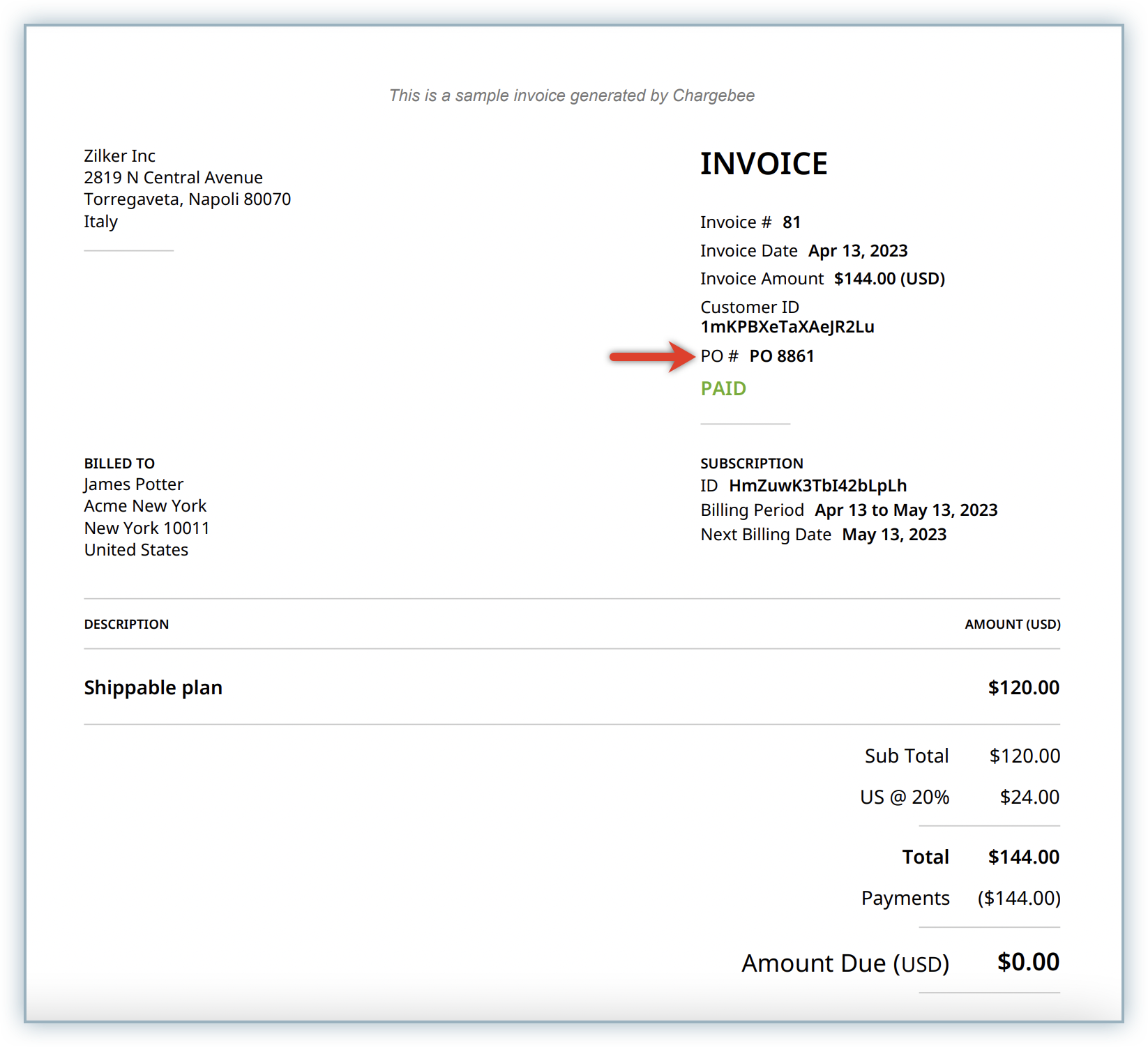 In Chargebee, PO Numbers help streamline procurement and payment processes by linking invoices to purchase orders for easy tracking and reconciliation. You can add, update, and display PO Numbers on invoices, subscriptions, and customer portals, ensuring clear reference for both buyers and sellers.