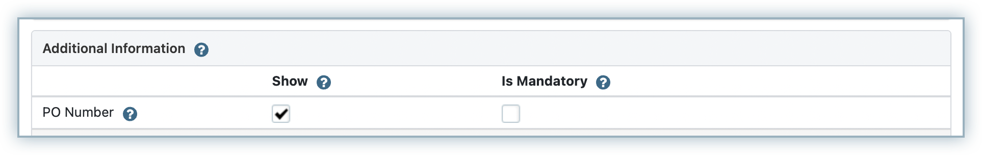 Single Page Checkout: PO Number can be enabled in the Additional Information section, under Settings > Configure Chargebee > Checkout & Portal > Field Configurations.