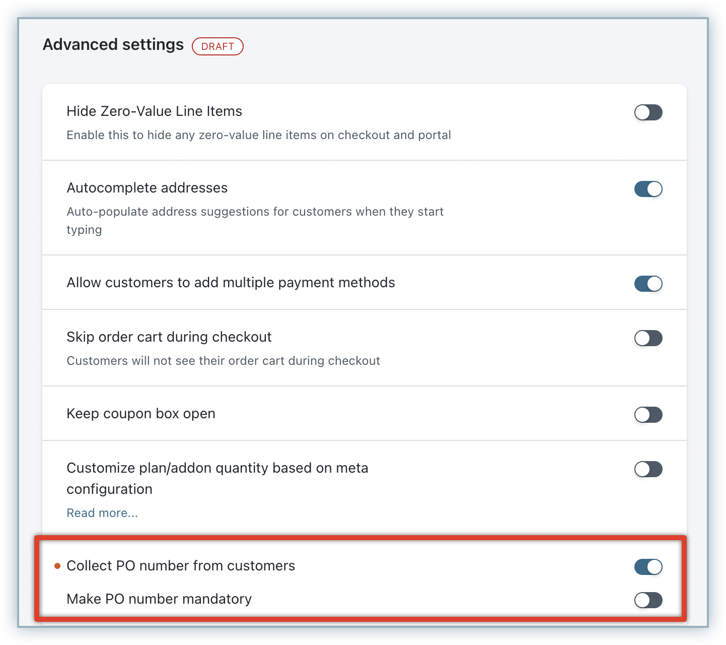 In-app Checkout: PO Number can be enabled in the Settings > Configure Chargebee > Checkout & Portal > Configuration > Advanced Settings.