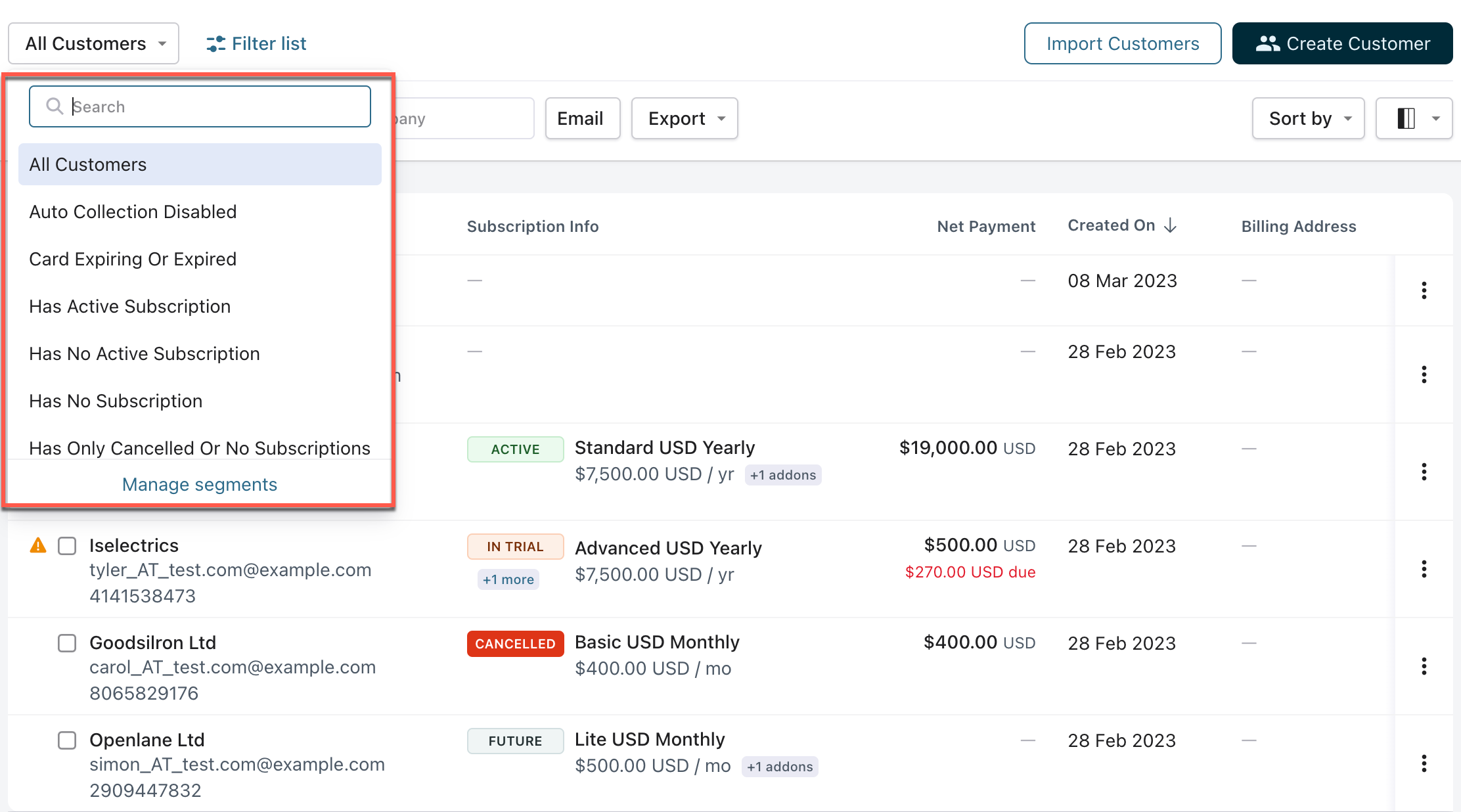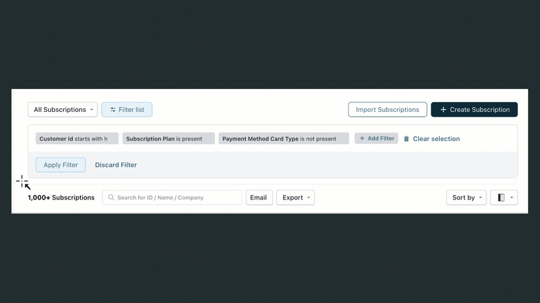 If you have a large number of subscriptions, customers, and products, you can use Chargebee's quick and advanced filter options to find what you're looking for quickly and simply.