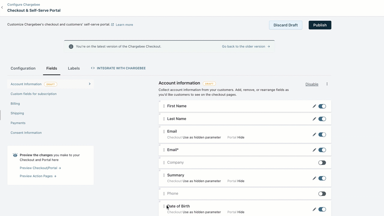 If you're using In-app Checkout, custom fields can be reordered by placing the field in the right position. Navigate to Settings > Configure Chargebee > Checkout and Portal > Fields