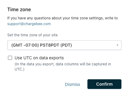 Updating the time zone in your Chargebee site will not affect your plan settings or the next billing date. For example, if you update the time zone from UTC to NZDT, your Chargebee site will reflect the current New Zealand time, and this update will be reflected in the next billing date as well.