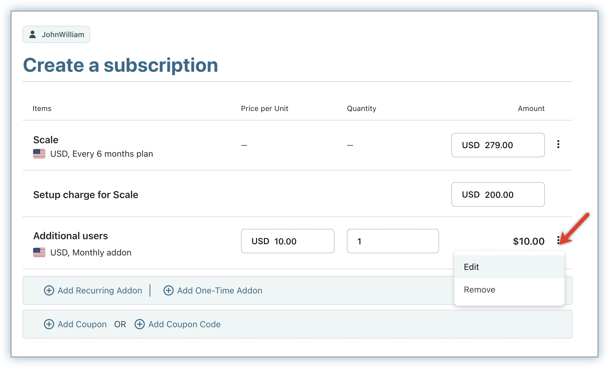 To add the add-on to a new subscription, navigate to Subscriptions and click Create New Subscription. Click Add Recurring Add-on. Here you choose the add-on and mention the billing cycle as well.