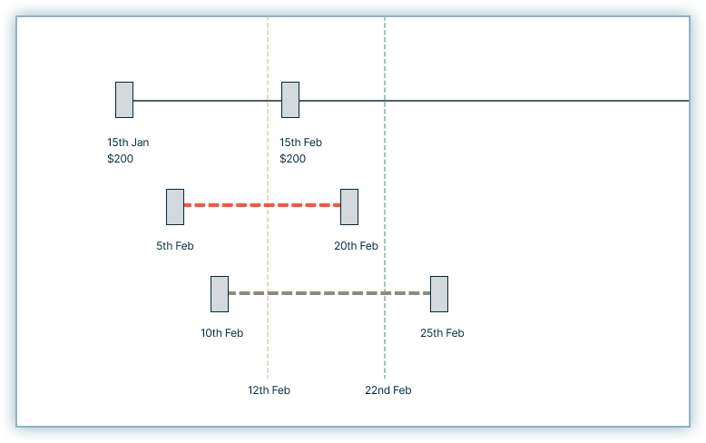 For example, the billing cycle for subscription is from January 15, 2025, to February 15, 2025. The subscription was canceled on February 12, 2025, and reactivated on February 22, 2025.