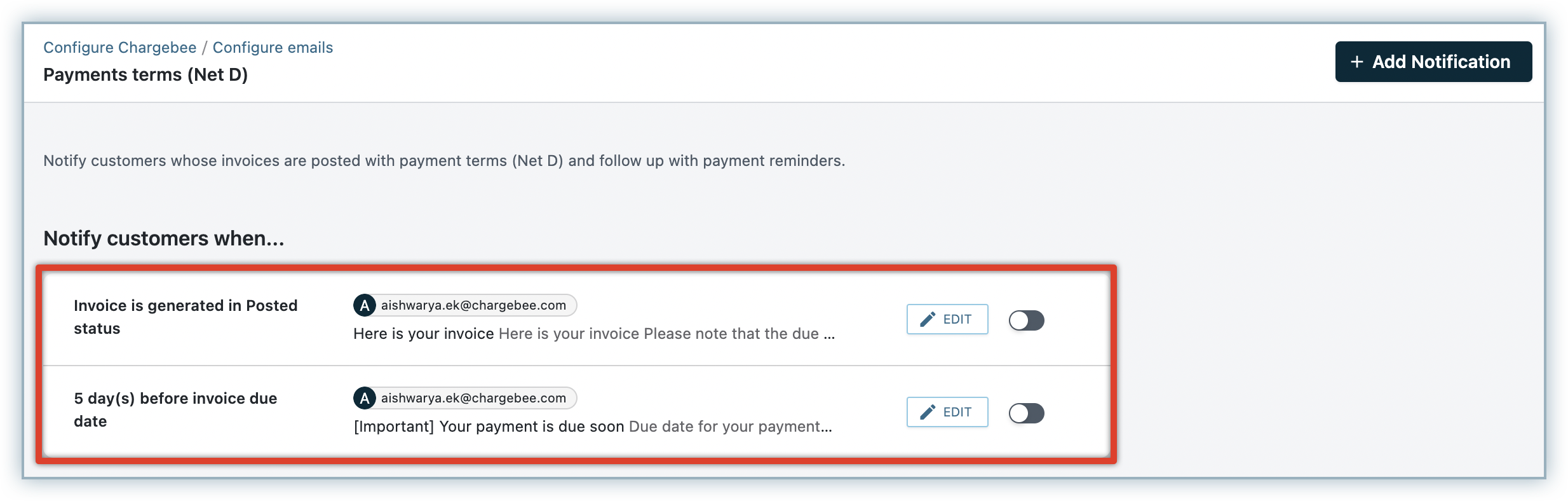 If you have Email Notifications V2 enabled in your Chargebee site, configure the email notifications for Net D by navigating to Settings > Configure Chargebee > Email Notifications > Invoices & Payments > Payments Terms (Net-D).