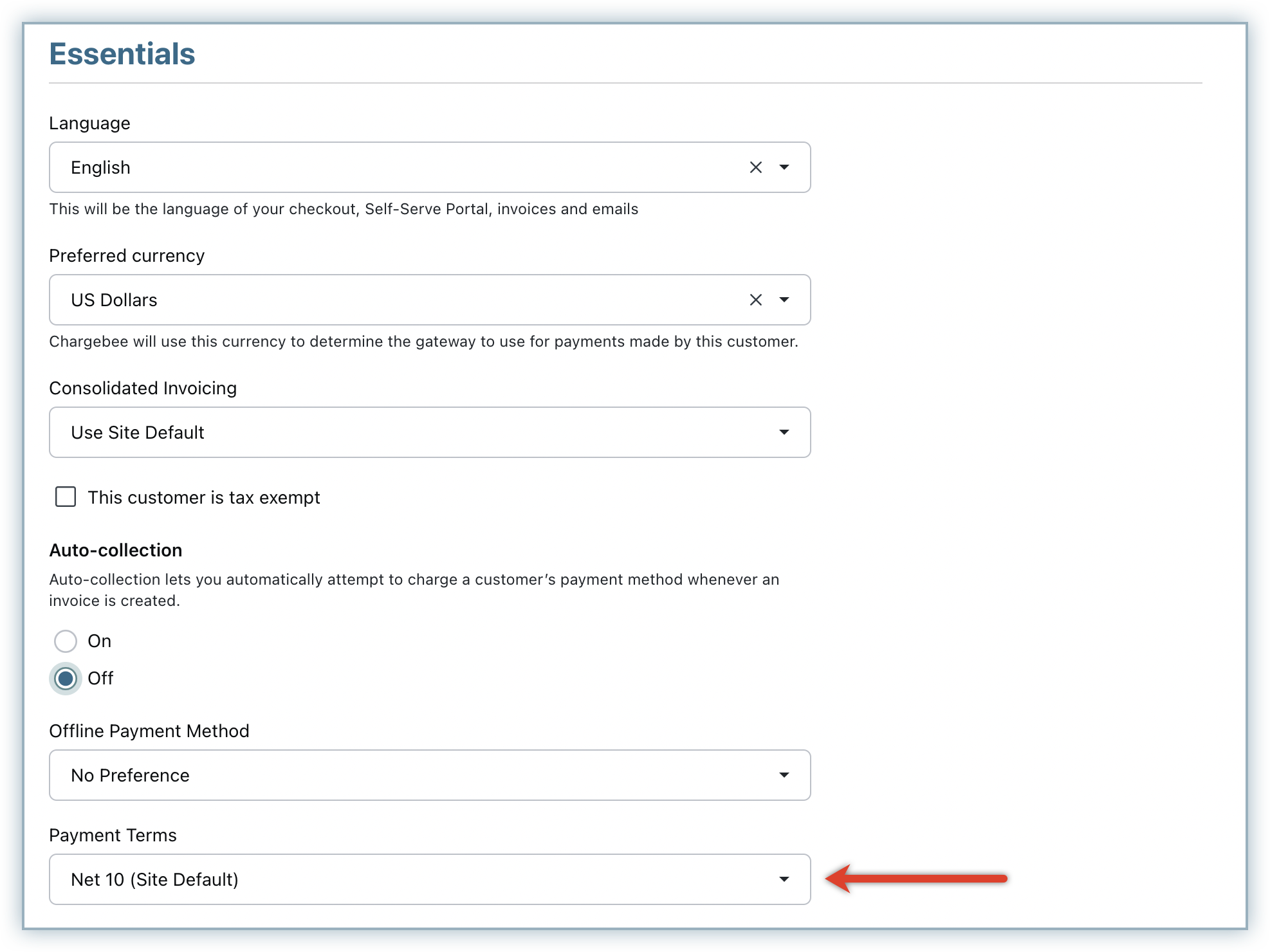 Additionally, the payment term chosen can also be stored with new customer records created with auto-collection on. If auto-collection is turned off for them later, the stored payment term is applied to their invoices. Contact support to enable this feature. The screenshot below shows how the details page of a new customer record looks after enabling this feature.