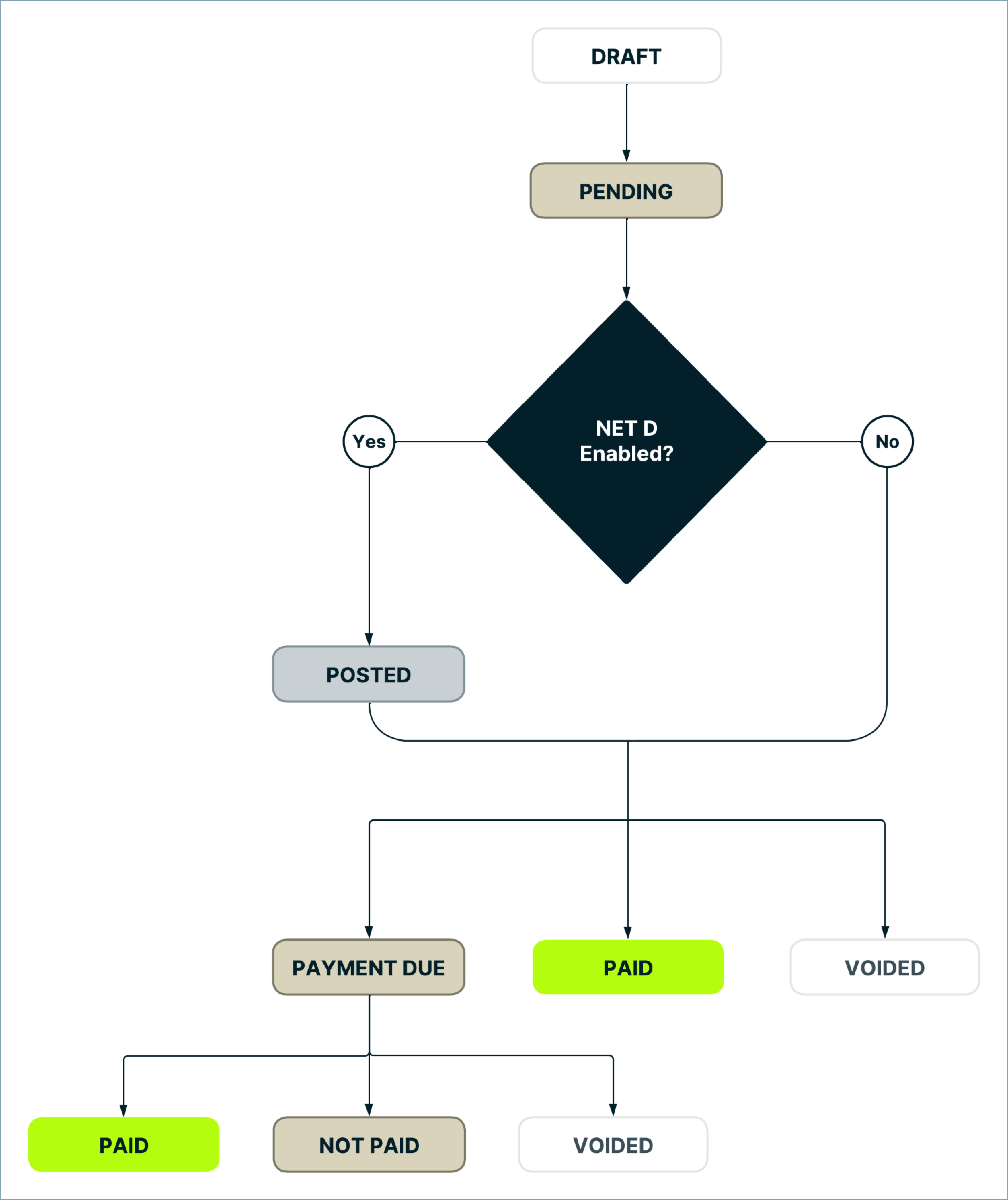 For example, if you've set Net 15 as your payment term, when an invoice is being generated, Chargebee will check whether Net D is enabled for your site. With Net D enabled, the invoice moves to Posted status. The customer can make the payment within the defined term, which in this case is 15 days. When the payment is made within 15 days, the invoice status is updated to Paid. If the customer fails to make the payment after 15 days, the status will be Payment Due or even Void based on the payment.