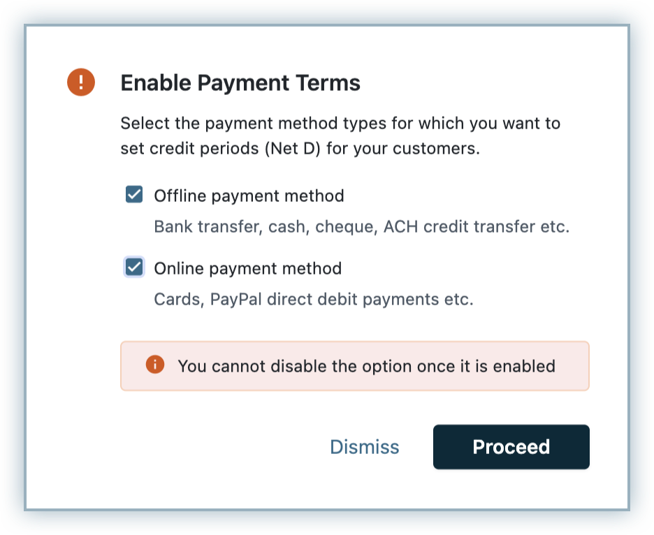 Note Once payment terms for offline payments are enabled, they cannot be disabled.