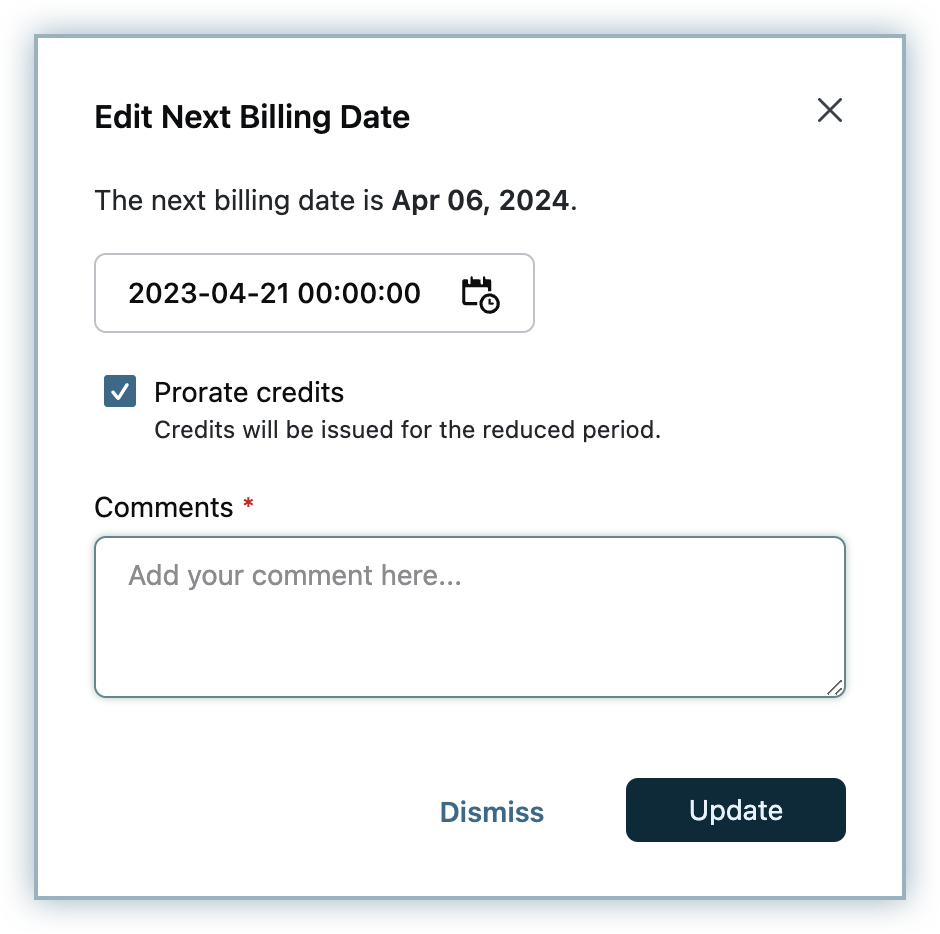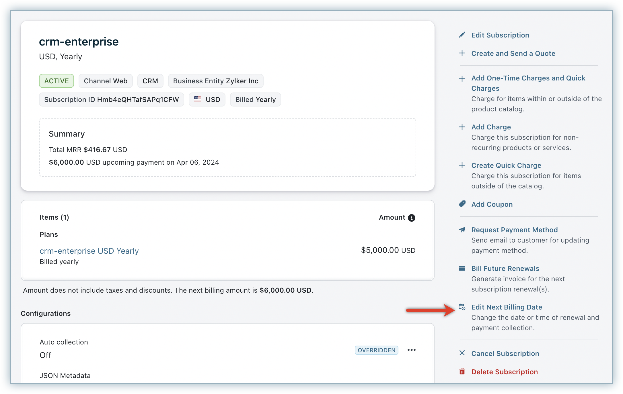 Next Billing Date refers to the date and time when a subscription will be renewed and payment will be collected. In Chargebee, the billing date/time is a subscription-specific attribute: it is based on the date and time of subscription activation and the billing frequency of the plan.