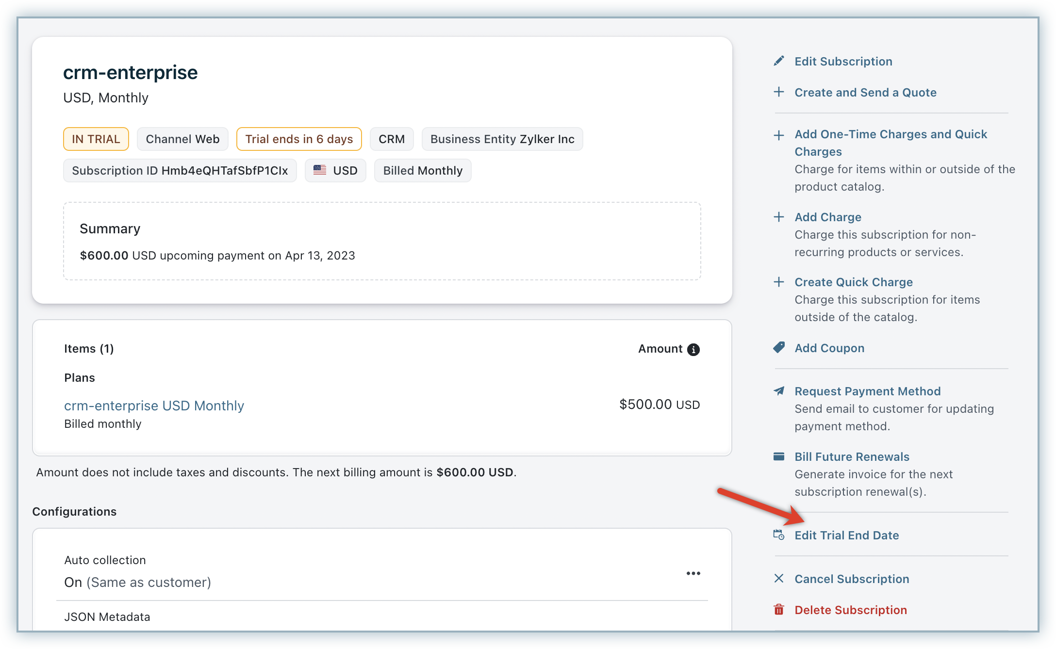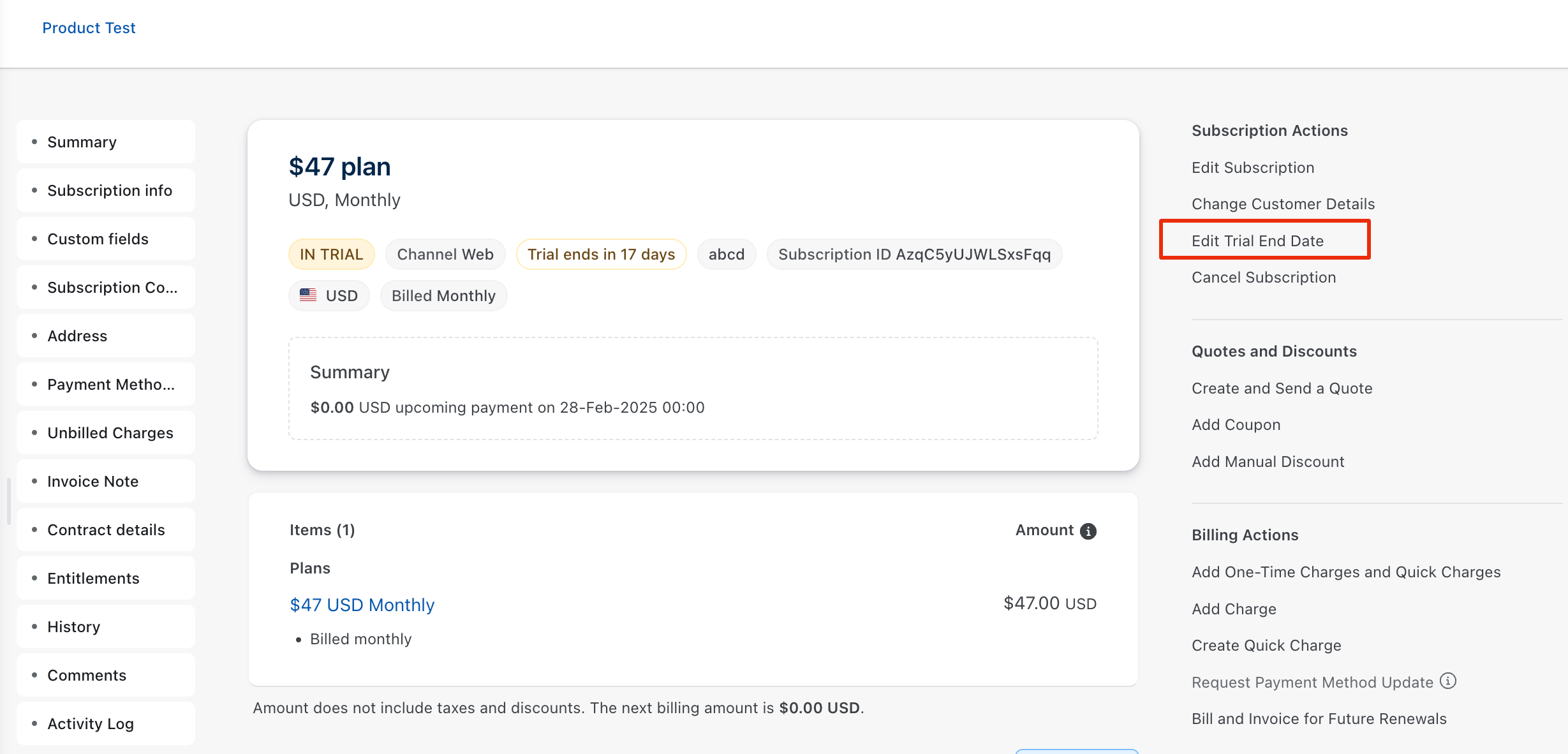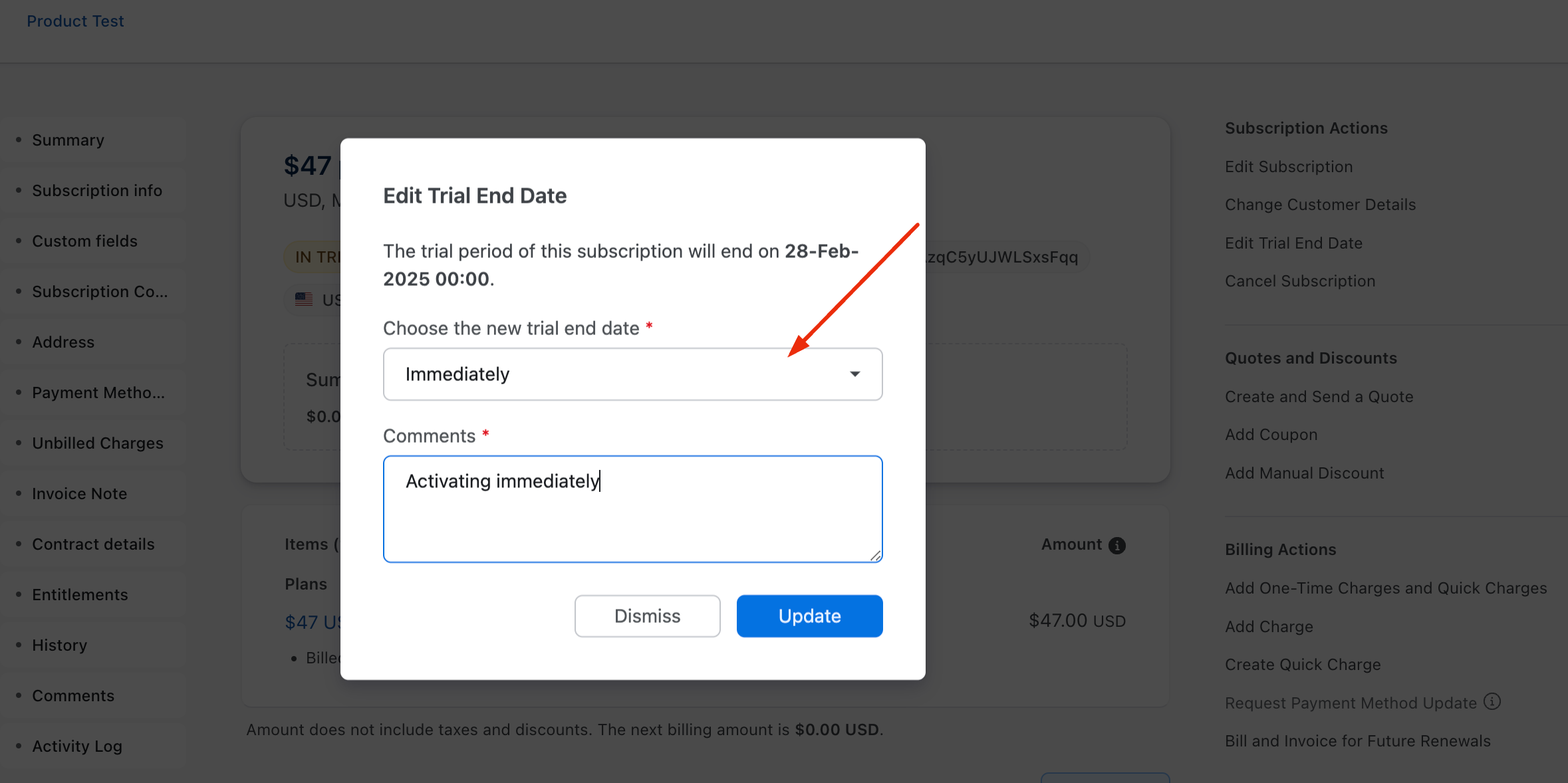 If you need to reactivate a canceled subscription, you can do so. When you are reactivating the subscription, you can also set a new trial date/time for it. Once the activation is complete, the subscription will be in trial.