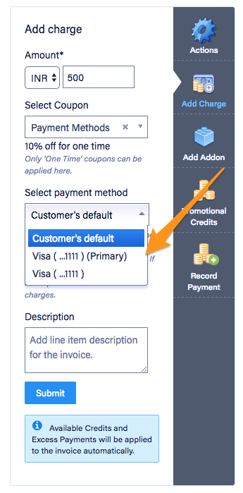 In addition to setting payment methods as Primary and Backup, you can assign a payment method to subscriptions or use a particular payment method when collecting a one time charge. If assigned to a subscription (or subscriptions, if a customer is subscribed to more than one of your plans), Chargebee will charge the payment method for all subscription related charges due, none of the customer's other payment methods will be used (even in the event that the assigned payment method fails).