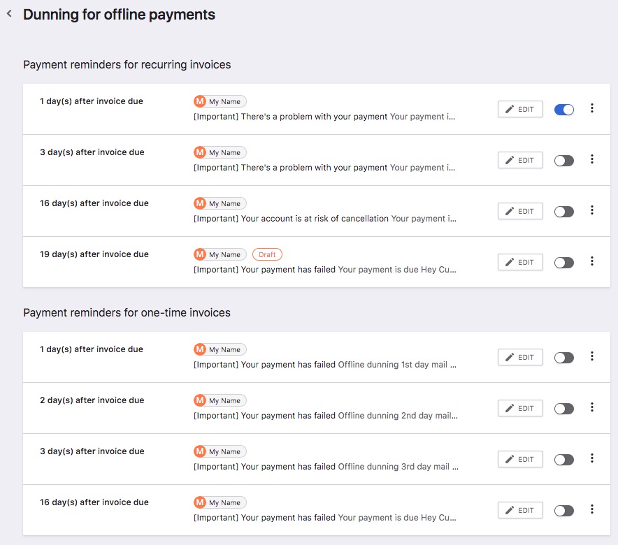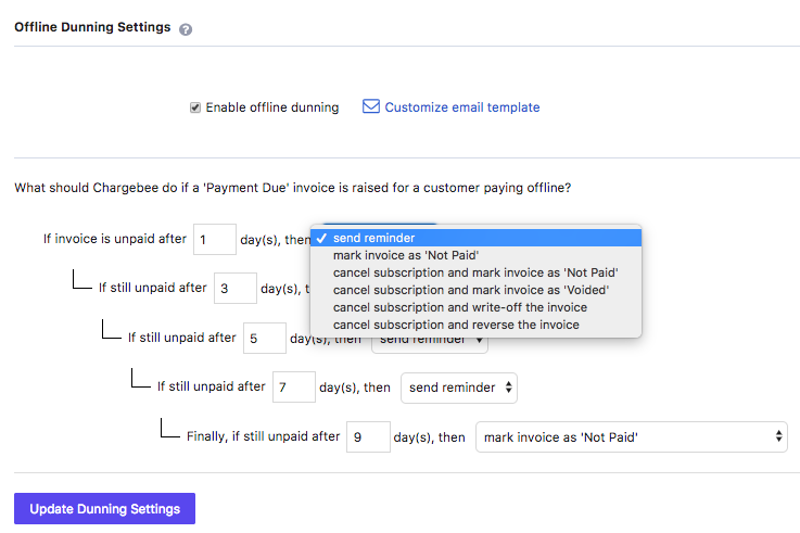 Unchecking Enable offline dunning will disable Offline Dunning and reminder emails will no longer be sent to your customers. If offline dunning is disabled: