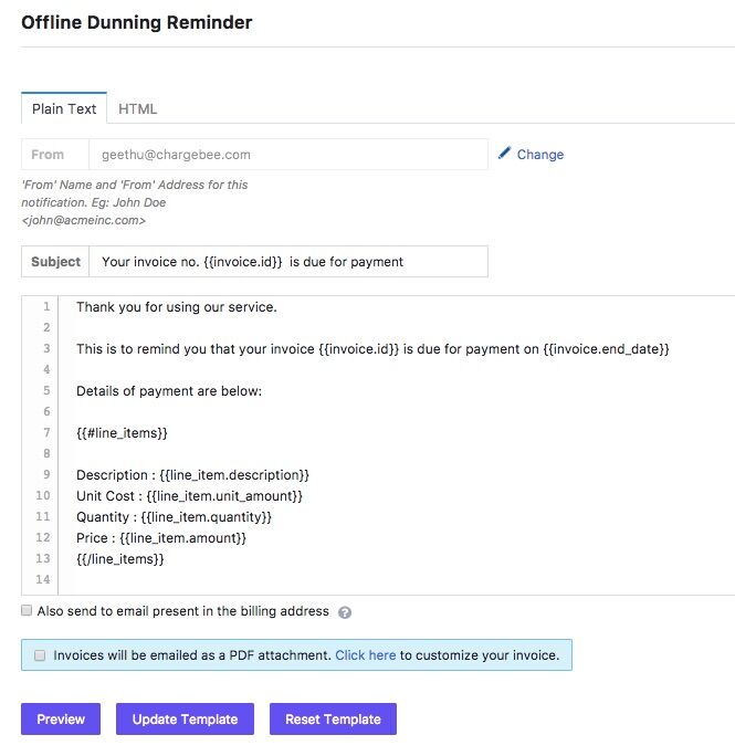 To configure the emails to be sent to your customers, login to your Chargebee site and navigate to Settings > Configure Chargebee > Email Notifications > Dunning for Offline Payments