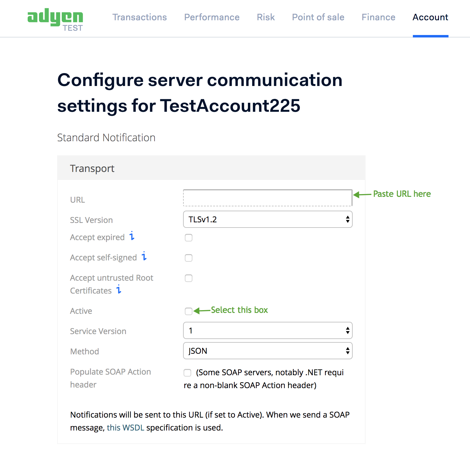 In your Adyen account, click Account > Server communication > Add Standard Notification. Add the Notification URL in URL field and select Active. Finally, click Save Configuration to save the changes.