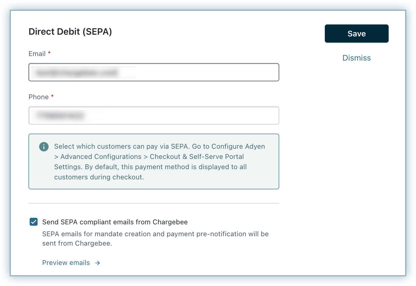 Enter your email and phone number into the respective fields. These are displayed in the Mandate creation and Pre-notification emails sent to your customers.