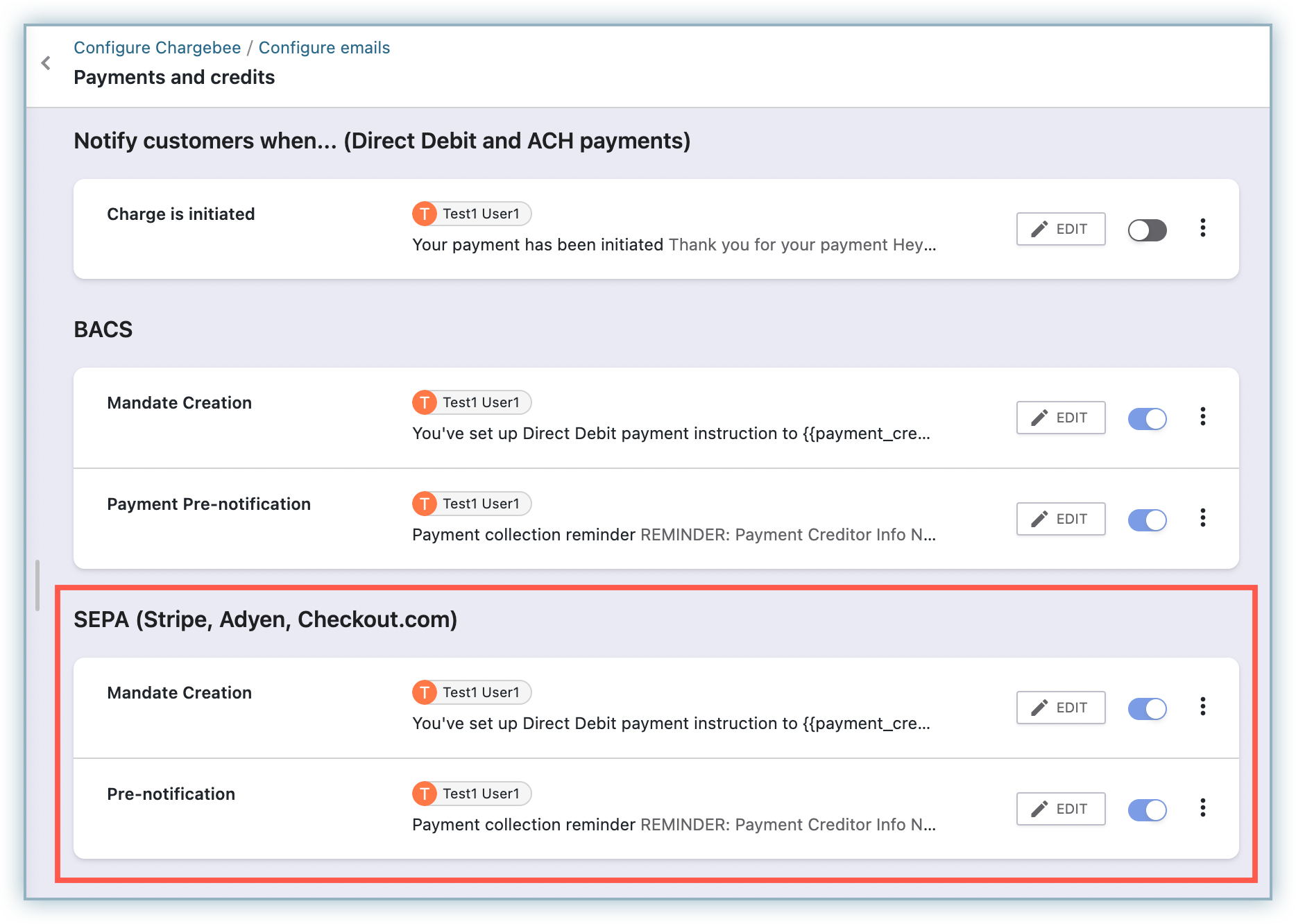 You can view and edit the content of these emails by clicking Settings > Configure Chargebee > Email notifications > Payments & Credits > SEPA.