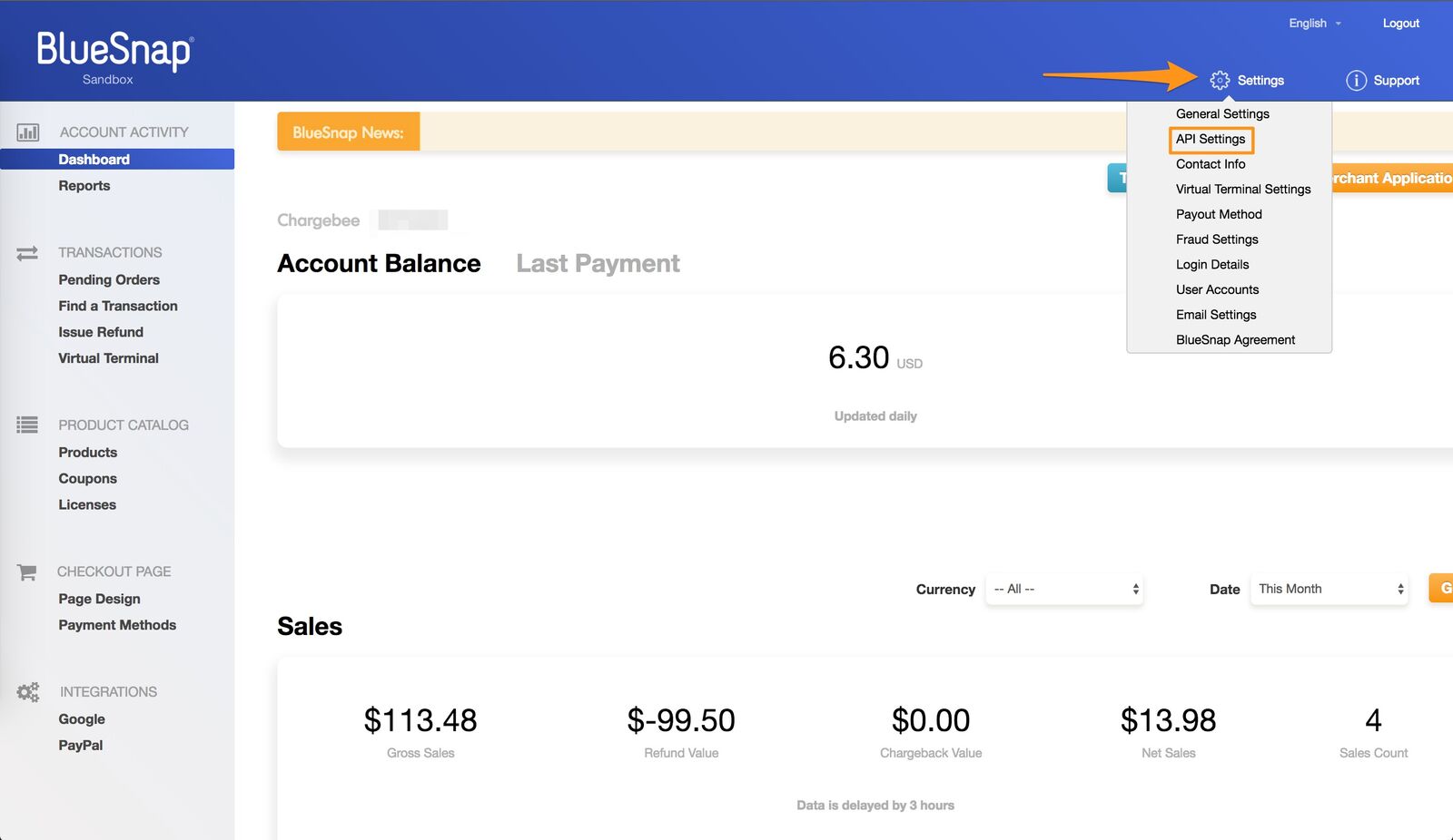 Step 2: Provide the API Username and API Password (retrieved from your BlueSnap account).